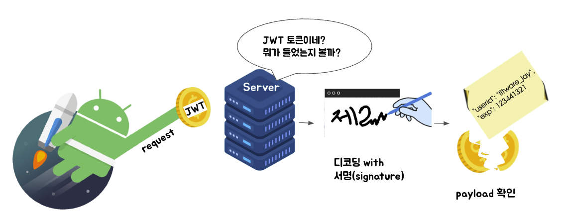 서버에서는 특정 알고리즘을 통해 서명(Signature)되어 생성된 문자열을 클라이언트로 전달하고 클라이언트는 이 jwt token을 가지고 있다가 api를 호출할 때 전달해주기만 하면 됩니다. 전달된 jwt token은 서버에서 decoding 하여 payload를 확인한 다음 권한을 부여하게 됩니다.