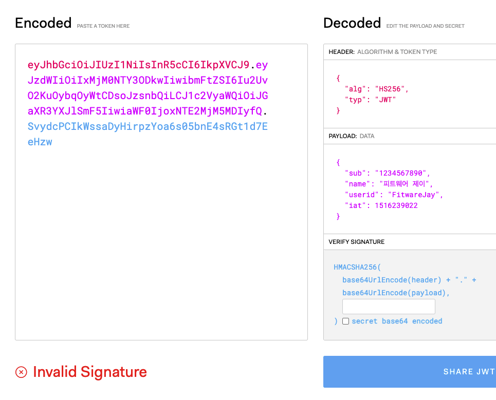 서명이 다른경우 invalid 헤더와 페이로드는 암호화된 값이 아니라 base64로 인코딩 된 값이기 때문에 위 이미지처럼 누구나 확인이 가능합니다.. 그렇기 때문에 토큰을 검증하는 서명(signature)이 정말 중요하며 서명에 사용되는 secret_key를 잘 관리해야 합니다!