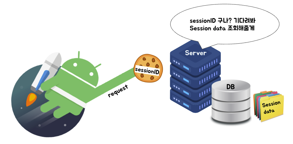 session정보는 DB에 저장되며 클라이언트는 sessionID를 가지고 있습니다. 클라이언트는 http request 요청 시 cookie에 sessionID를 저장하여 보내고 서버에서는 전달받은 sessionID로 DB에서 session을 조회합니다!