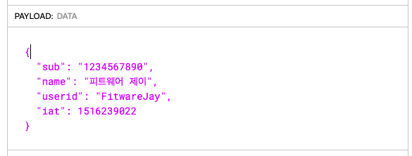 페이로드 구조 페이로드에는 사용자, 토큰 정보를 나타내는 클레임(claim)이라는 것으로 구성되어 있고, key-value 형태입니다. 클레임에는 사용자 마음대로 아무런 값을 넣을 수 있습니다. (다만 클레임이 많아질수록 토큰의 길이가 길어집니다)