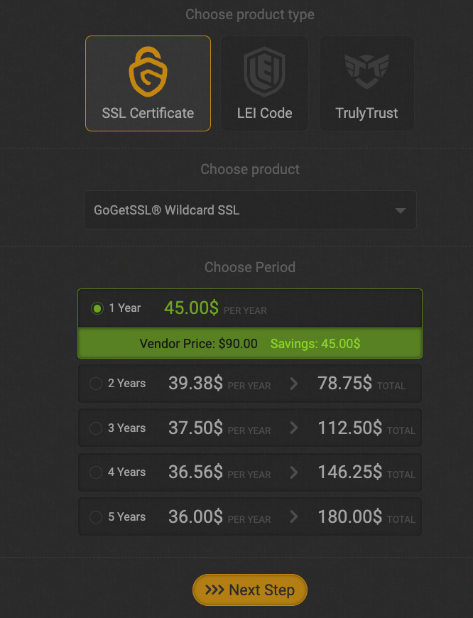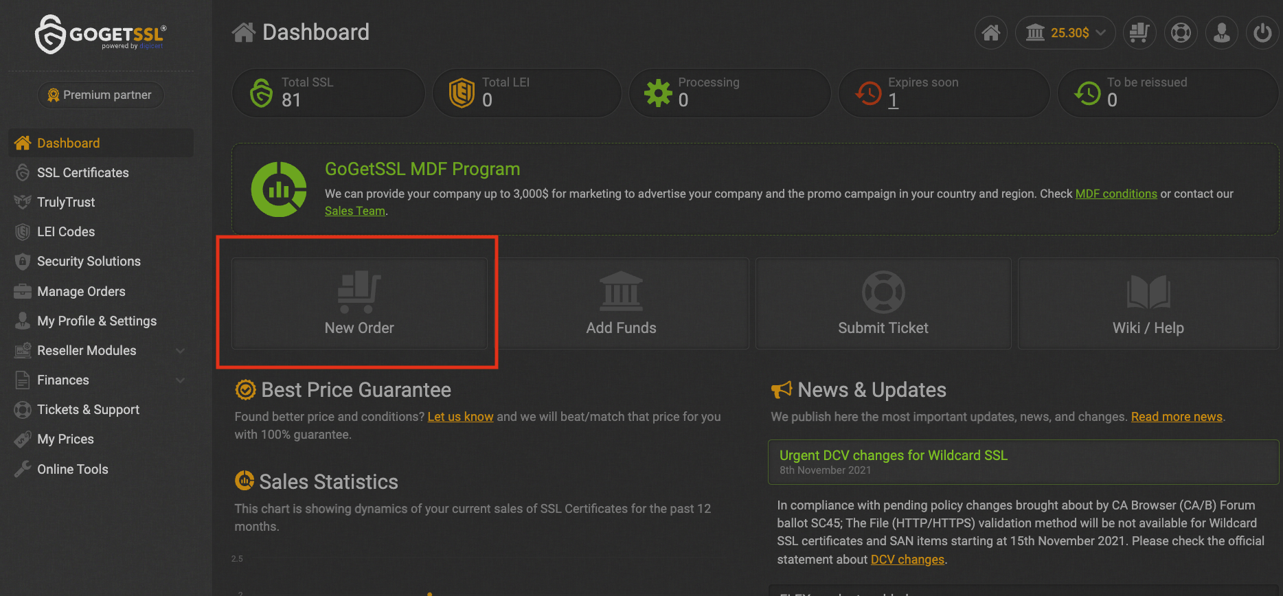 새로운 주문 실행 먼저 메인 대시보드에서 New Order 버튼을 클릭하면 새로운 ssl 인증서 주문 페이지로 이동합니다.