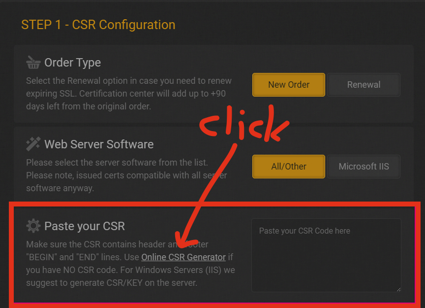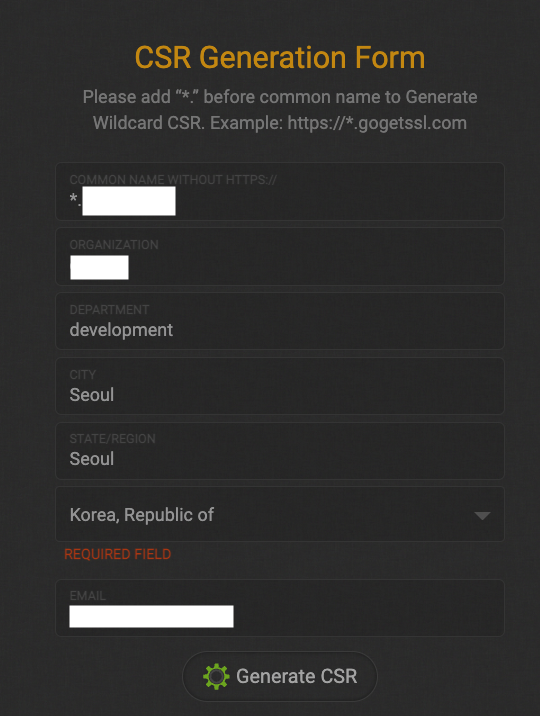 CSR Configuration과 온라인 CSR Generator form 다음은 CSR을 입력하는 폼이 나옵니다. 자세히 보면 온라인 CSR Generator가 있어서 그걸 클릭하면 CSR을 생성할 수 있는 폼으로 이동합니다. 폼을 통해 CSR을 생성하면 Private, Public Key가 생성됩니다.