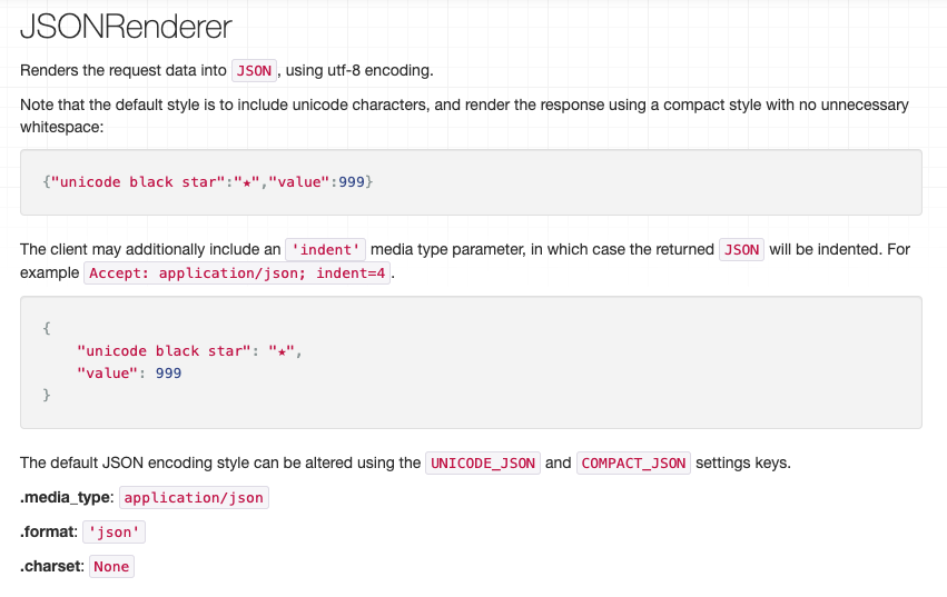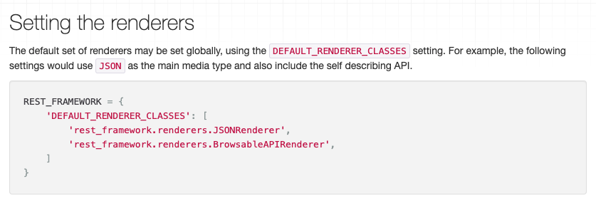 공식문서 Rederers 설명 DRF 공식문서를 찾아보니 renderer에 대한 설명과 default renderer에 대해서 나와있었습니다. 기본적으로 settings에 아무런 설정이 없다면 JSONRederer, BrowableAPIRenderer를 기본으로 사용하고 있습니다.