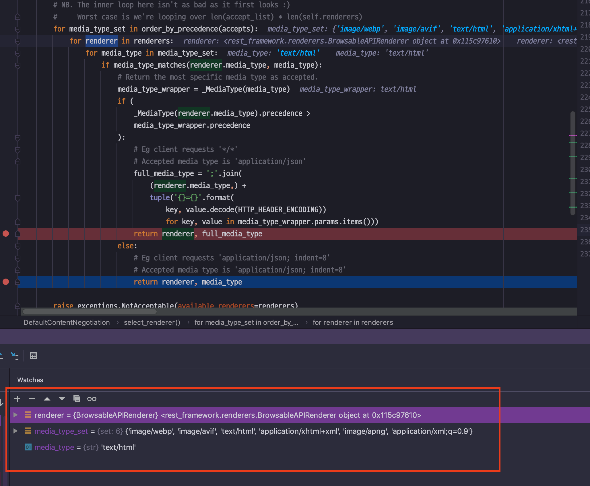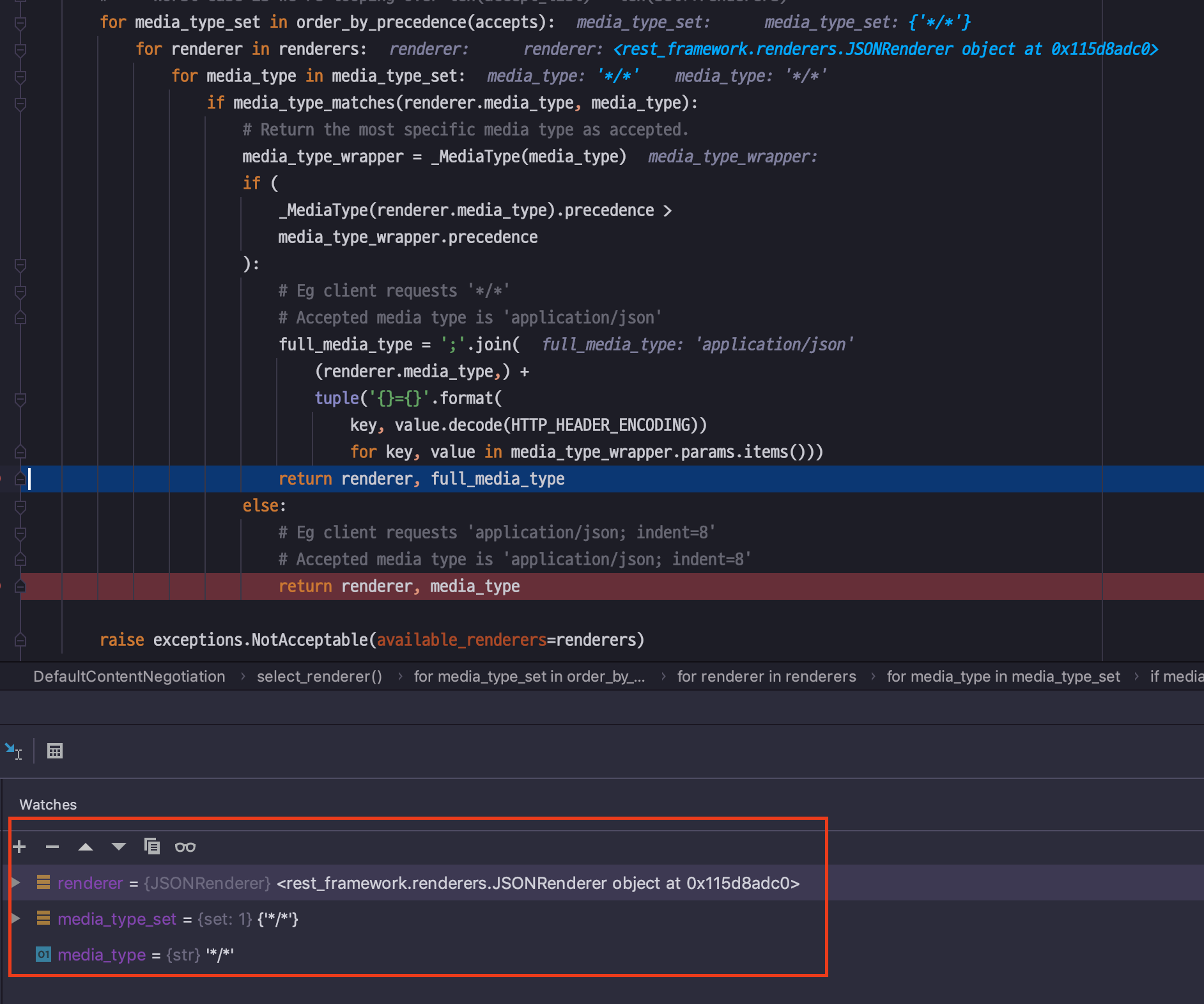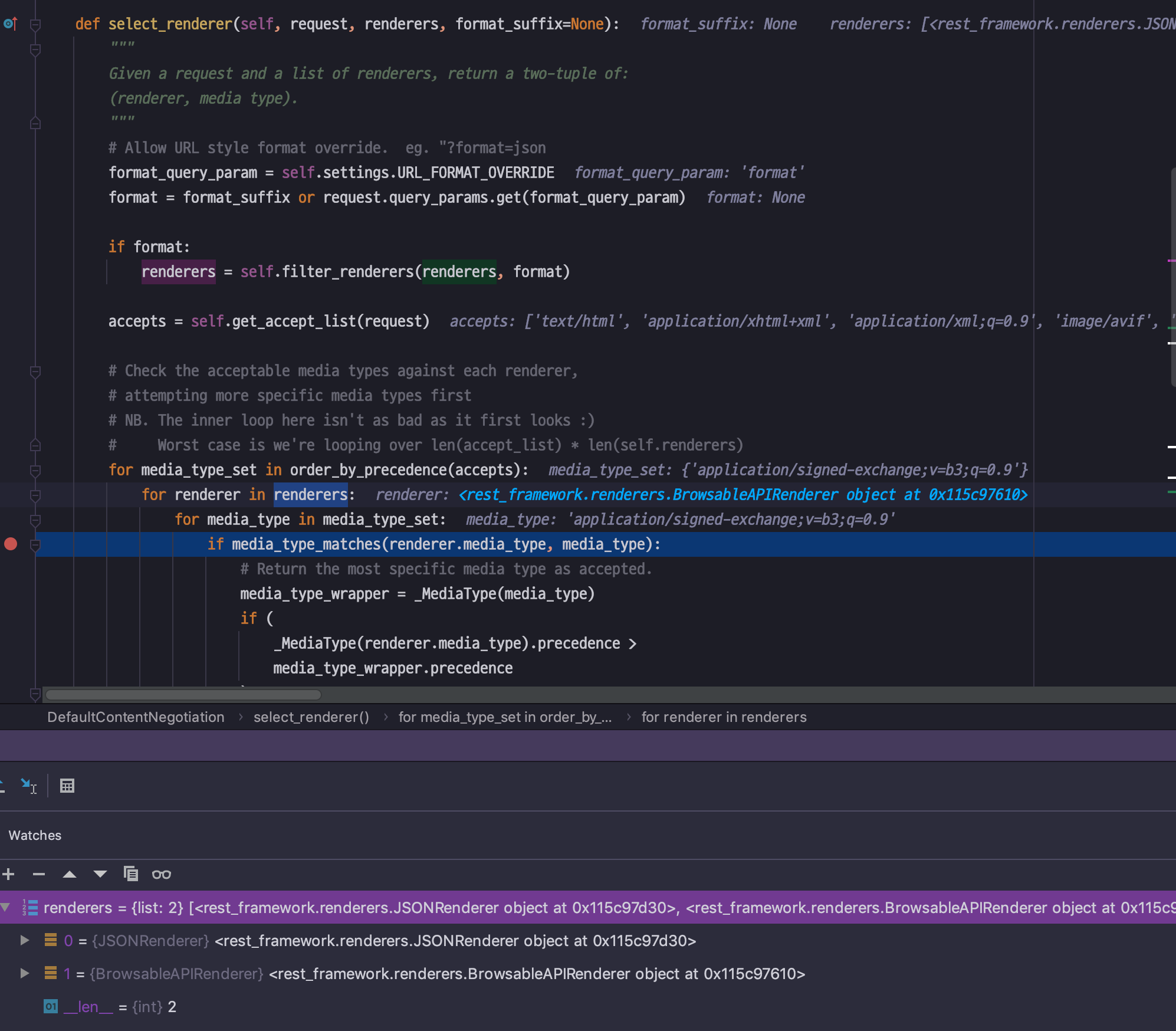 select_renderer 함수에서 default renderer중에 선택 디버깅을 찍어 보았을 때 select_renderer 함수에서 media_type을 통해 어떤 renderer를 선택해야 할지 체크하고 있었습니다.