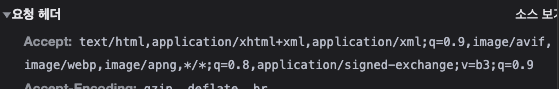 먼저 브라우저에서 어떤 Accept가 있는지 확인을 해보겠습니다! 개발자 도구 네트워크 탭에서 request header를 보겠습니다