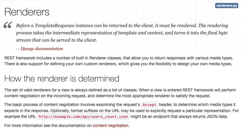 위 로직에서 accepts에 있는 media_type들의 순서를 odering 뒤 for loop를 돌리고 loop안에서는 rederer가 rendering 할 수 있는 media_type인지 체크합니다.