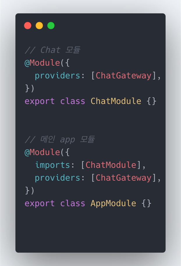 모듈 주입 상태 어... 음 메인 app모듈에서 ChatModule을 import 하고 있었고 providers에는 ChatMoudule에서 이미 주입했던 ChatGateway를 주입해주고 있었습니다. (홀리몰리)