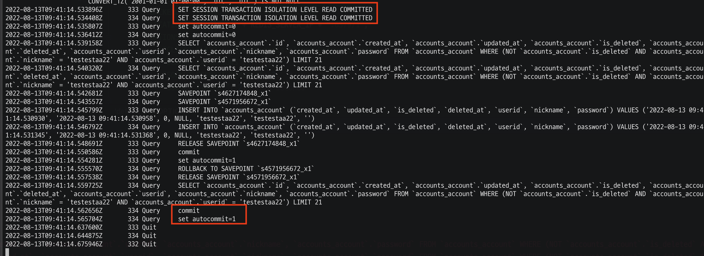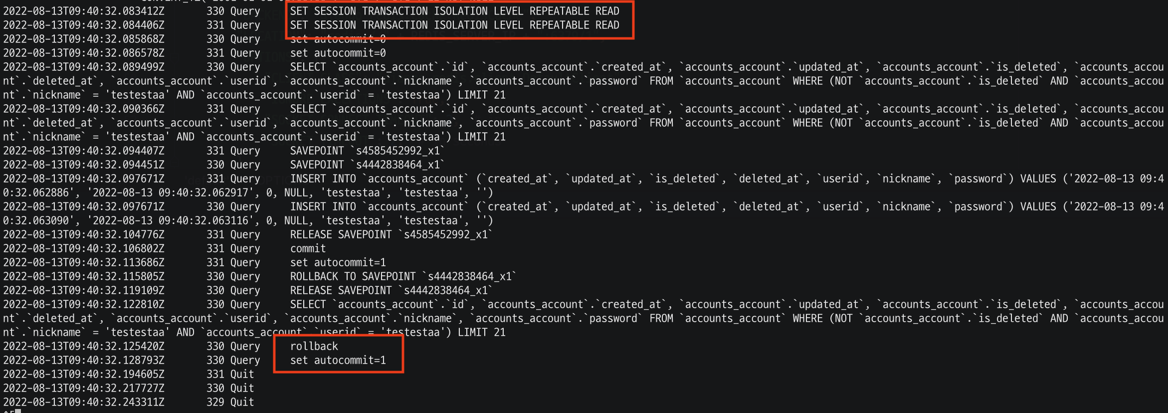 추가로 django에서는 isolation level을 기본적으로 READ COMMITED을 사용하고 있었습니다. 몰랐는데 mysql.cnf에서 transaction-isolation옵션을 변경해도 query log를 보면 항상 SESSION TRANSACTION ISOLATION LEVEL READ COMMITED로 실행이 되더라고요!