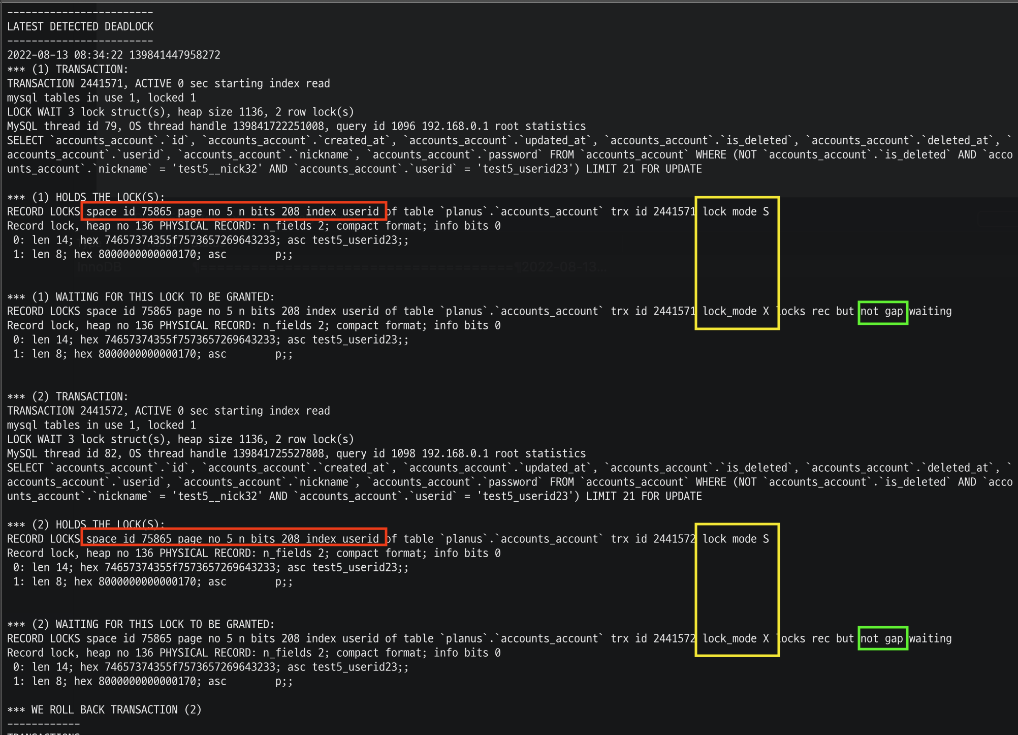 - waiting for this lock to be granted : 트랜잭션이 실행하기 위해 lock을 걸어야 하는 데이터에 대한 정보, 즉 row에 대한 정보를 보여줌.select_for_update()는 row lock을 잡는다고 했습니다. 위 상황을 해석하면 트랜잭션 A와 트랜잭션 B가 동일한 space id에 레코드 락(record lock)을 걸었고 데이터를 쓰기 위해 서로의 락 해제를 기다리고 있는 상태입니다.
