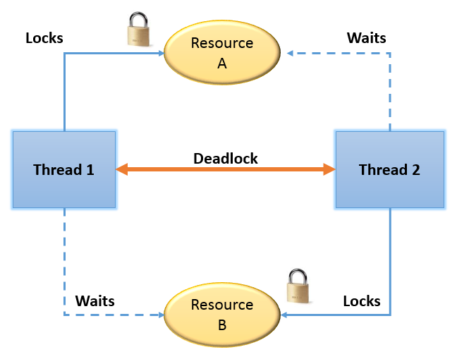 출처:https://jojozhuang.github.io/programming/java-concurrency-dead-lock/ 위 이미지처럼 두 개의 스레드가 각각 A, B 리소스를 먼저 lock을 건 상태에서 그다음 B, A 리소스로 서로 접근하려고 할 때 lock이 해제되기를 기다리는 상태가 데드락 상태입니다. 둘 중 먼저 하나라도 lock이 해제가 돼야 하는데 서로 기다리고 있으니까 lock이 해제되지 못하고 결국 오류가 나는 거죠!