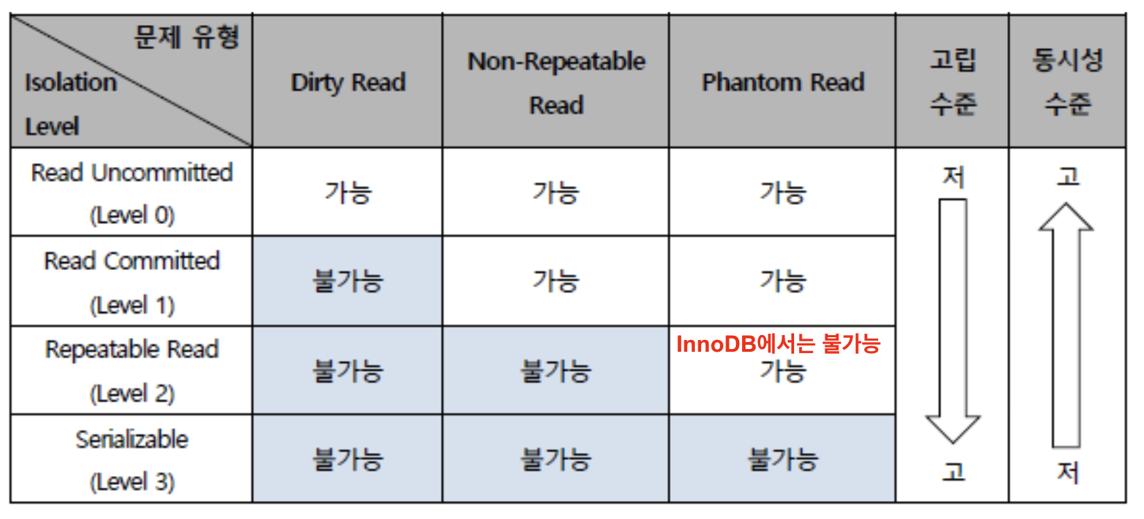 출처:http://blog.skby.net/dirty-read/ InnoDB의 Isolation level은 위와 같이 4가지로 되어 있습니다! MySQL은 default로 REPEATABLE READ를 사용합니다! 특이한 점은 REPEATABLE READ를 사용하면 InnoDB에서는 Phantom Read가 불가능합니다. REPEATABLE READ에서는 특정 시점의 sanpshot을 가지고 있어서 Phantom Read가 발생하지 않고 매번 같은 select query 결과를 확인할 수 있습니다.
