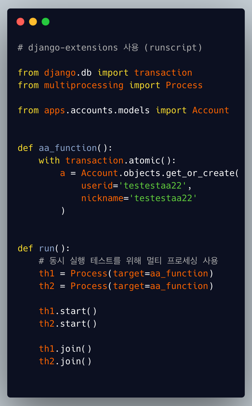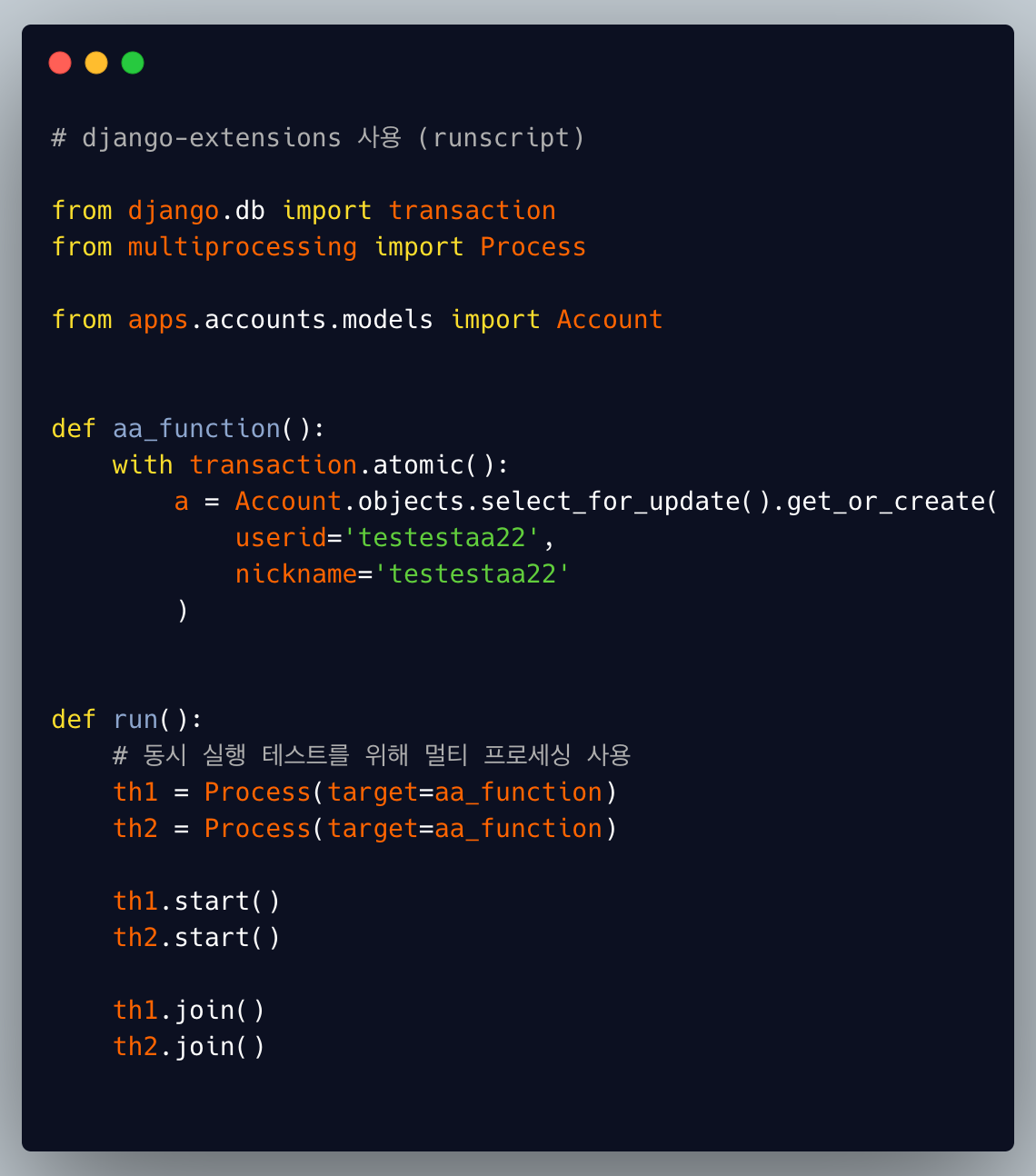 select_for_update() 사용 select_for_update()는 트랜잭션이 끝날 때까지 row lock을 잡는 ORM입니다. 위 예제를 보면 Account 모델에 userid, nickname에 매칭 되는 row가 있는 경우 가져오고 없으면 생성합니다.