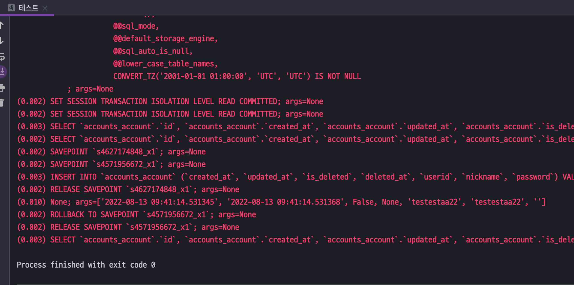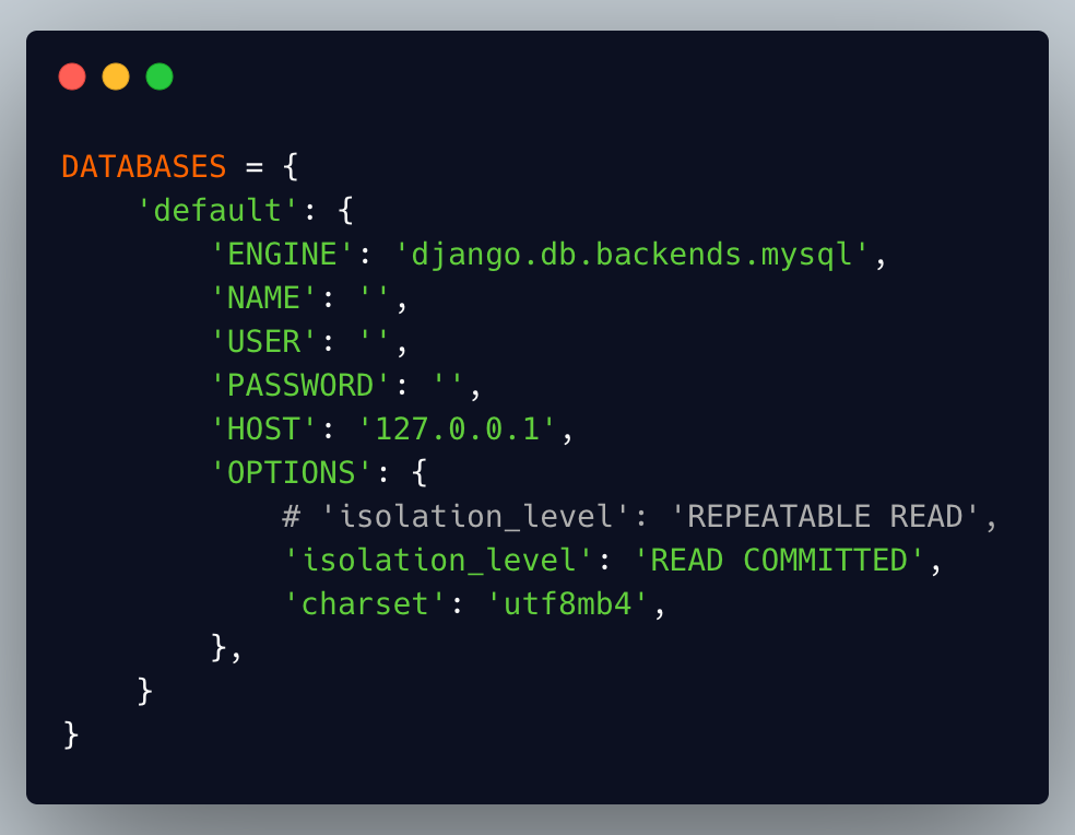 django에서 mysql isolation level을 따라가는게 아니라 django default 세팅을 사용하는듯 그래서 테스트를 할 때마다 아래와 같이 데이터베이스 세팅을 변경해야 합니다. 몰랐는데 database 세팅에서 isolation level을 변경 가능하더라고요!