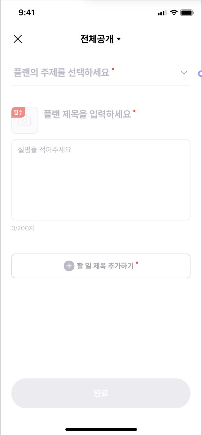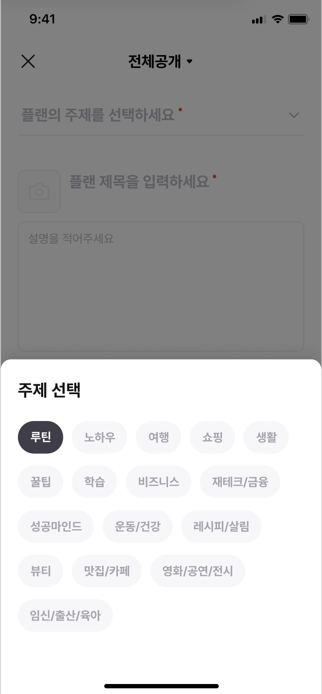 플랜을 생성하는 에디터(?) 저희가 만들면서 정말 공들였던 부분이기도 한 플랜작성 화면입니다. 아무래도 유저가 작성하기 편해야지 콘텐츠들이 많이 생성될 것 같아서 앱 개발자 분들과 디자이너, PM분들이 많이 고민해주셨던 영역입니다.