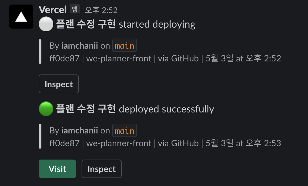 프론트엔드 배포로 vercel을 이용 프론트엔드 개발을 맡으셨던 찬희 님께서 vercel 이란 걸 통해 웹 배포를 해주셨는데 상당히 편하고 바로바로 변경사항을 볼 수 있어서 좋았습니다. 깃 헙과 연동하여 바로 배포가 가능한 서비스 같은데 빠르게 진행되어야 하는 해커톤 기간동안 바로 바로 변경사항을 볼 수 있어서 좋았습니다.