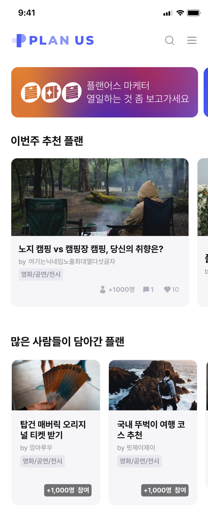 메인 화면과 카테고리, 플랜 상세 화면 해커톤에서 진행했던 디자인과 전혀 다르죠?! ㅋㅋㅋㅋ역시 디자인은 디자이너에게 맡겨야 하는 것 같습니다! 디자이너 경하님 덕분에 정말 예쁜 플랜어스로 변했습니다.