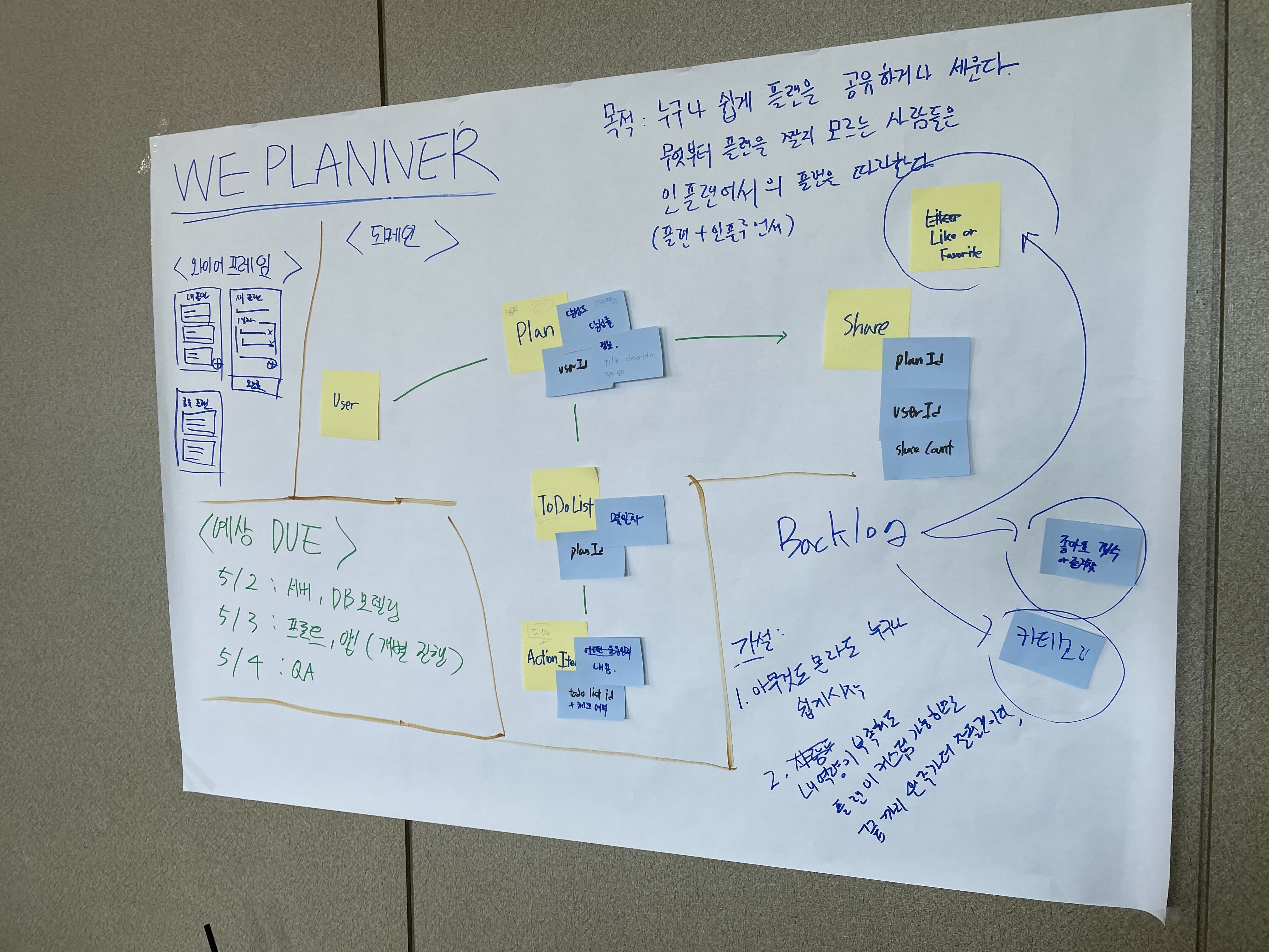 제 아이디어인 '위플래너'를 꼭 하고 싶어서 크루들에게 엄청난 어필을 하였습니다 ㅋㅋㅋ 덕분에 해커톤 진행 아이디어 중 하나로 선정되었고 모인 팀원들과 함께 세부 아이디어를 계획했습니다.