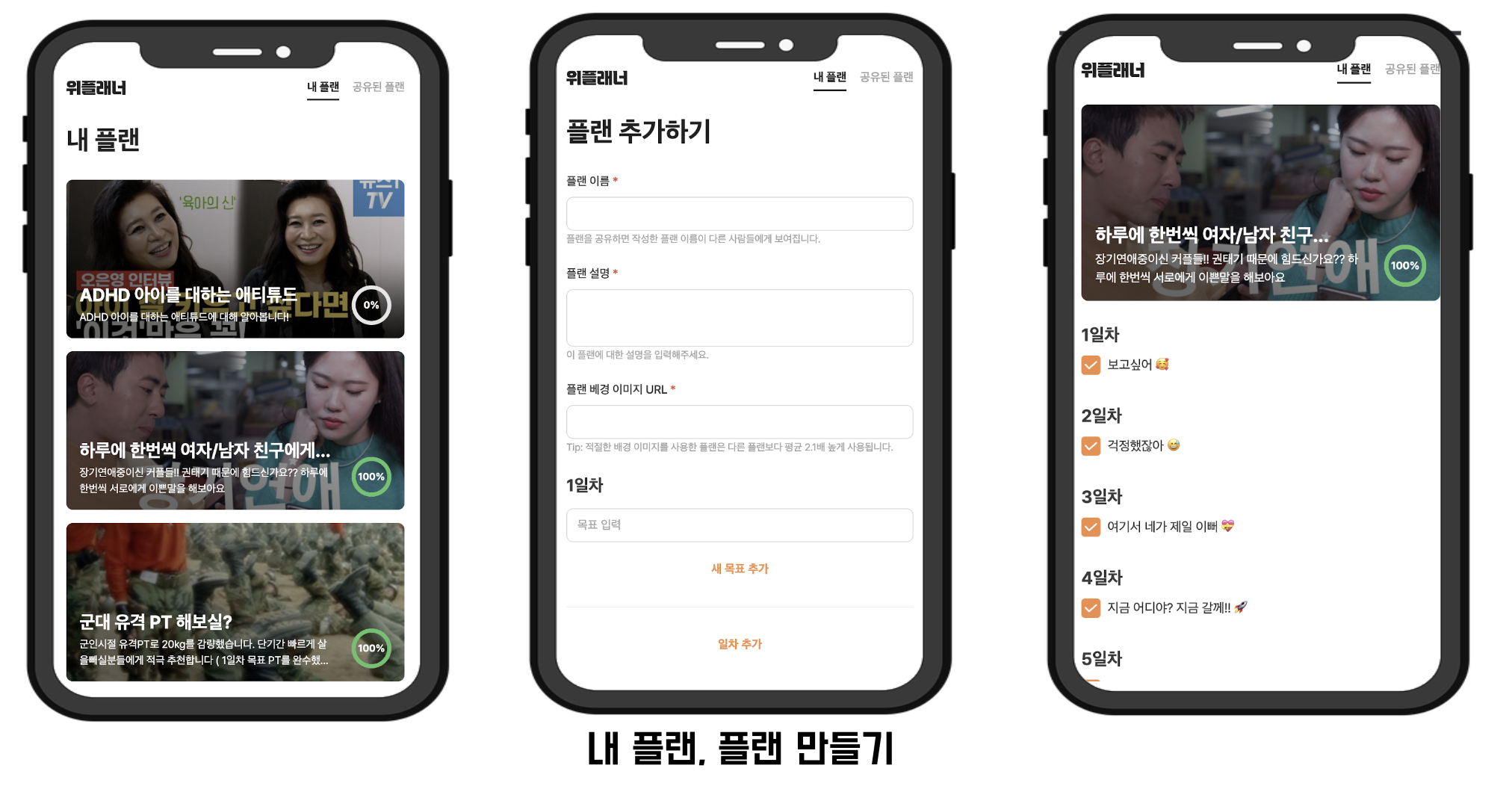 [안드로이드] 진행중인 플랜 화면 웹으로 구현된 위플래너 시연영상 서비스에 대해 간단히 한번 더 설명드리면 누구나 플랜을 만들어서 공유할 수 있고 공유된 플랜을 다운받아서 내 플랜으로 가져와서 진행할 수 있습니다. 플랜이라고는 했지만 투두 리스트도 되고 여러 가지 의도로 사용할 수 있습니다.