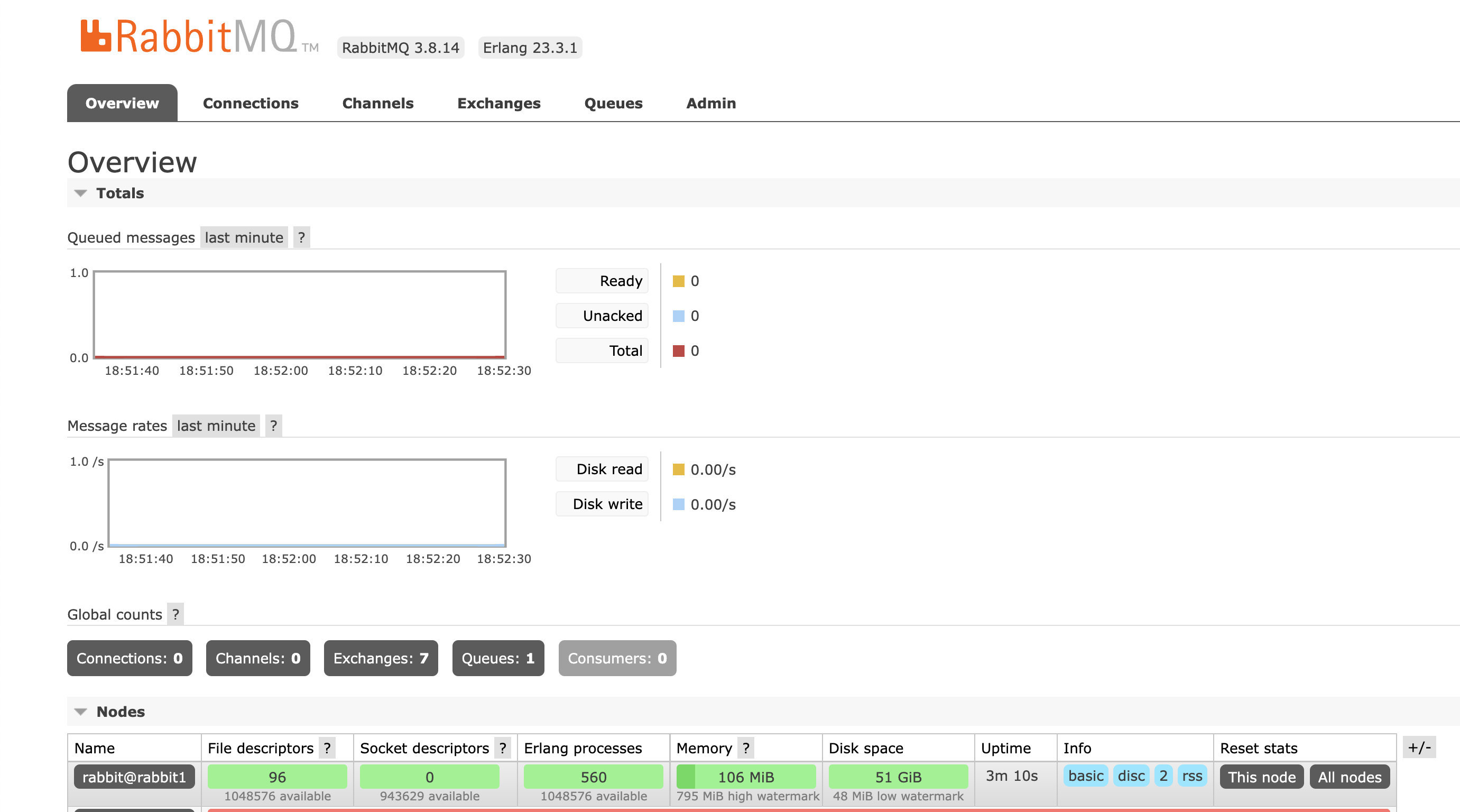version: '3.1'networks:app-tier:driver: bridgeservices:rabbit1:image: rabbitmq:3.8-managementcontainer_name: rabbit1hostname: rabbit1ports:- "5671:5671"- "5672:5672"- "15671:15671"- "15672:15672"volumes:- "본인 환경에 맞는 로컬 경로":/var/lib/rabbitmqenvironment:- RABBITMQ_DEFAULT_USER="디폴트 사용할 유저"- RABBITMQ_DEFAULT_PASS="디폴트 사용할 비밀번호"- RABBITMQ_DEFAULT_VHOST=defaultnetworks:- app-tiercs docker-compose 파일 작성을 위처럼 작성한 후 docker compose up -d 명령어로 컨테이너를 실행시킵니다. 127.0.0.1:15672로 접속해서 설정한 유저, 비밀번호로 접속하면 RabbtMQ GUI를 만날 수 있습니다!