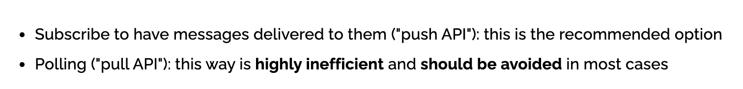 Pull방식은 Consumer에서 메세지를 일정 시간 pulling 해서 처리하는 방식이라고 합니다. pull방식은 아무래도 메시지가 없을 때도 지속적으로 네트워크 리소스를 사용하기 때문에(계속 pulling 해야 하므로) 매우 비효율적이라고 합니다.