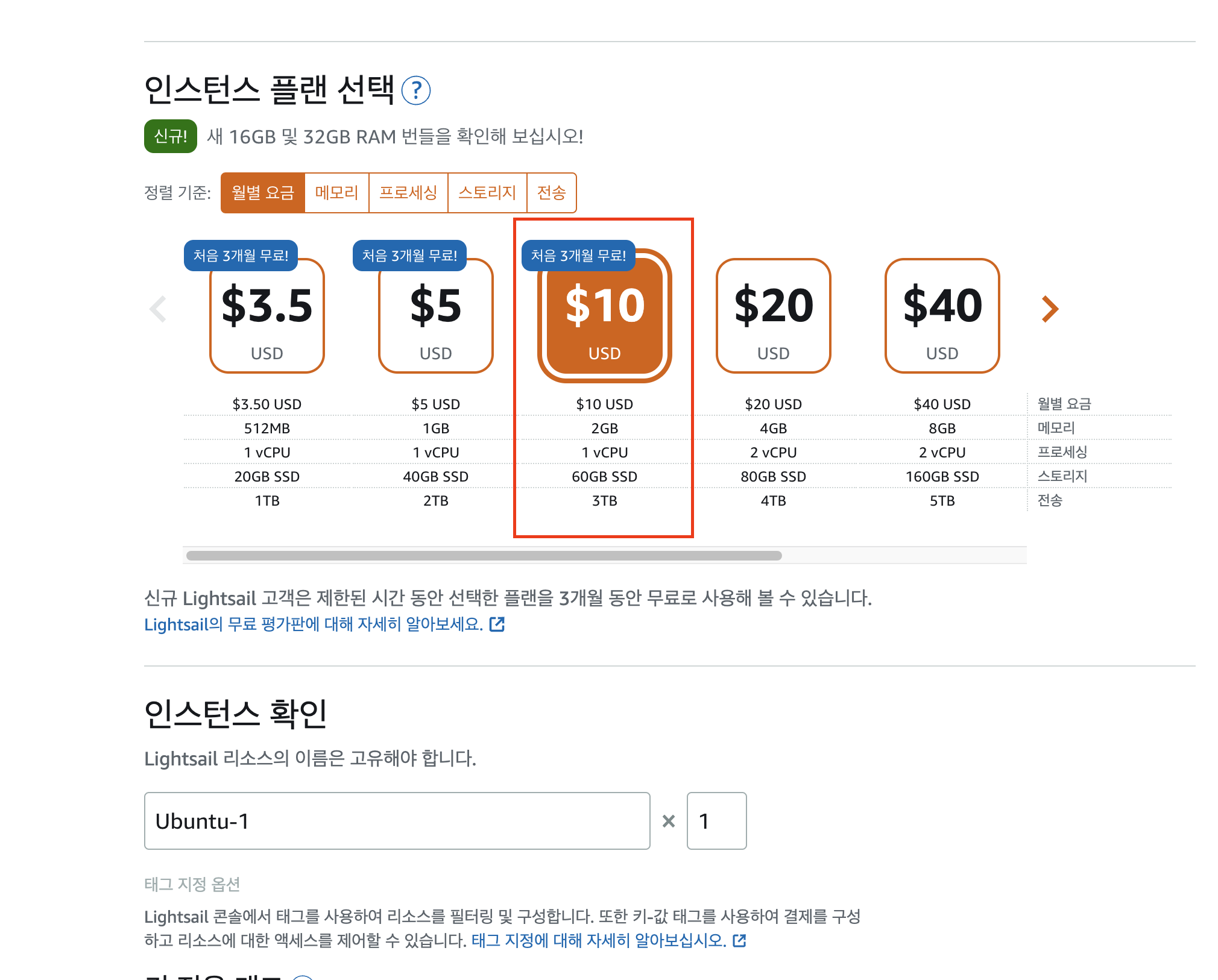 클릭 몇번으로 인스턴스를 생성할 수 있다 Lightsail은 클릭 몇번으로 원하는 사양과 목적에 맞는 서버를 생성할 수 있습니다. 저는 홈서버와 비슷하게 하나에 서버에 nginx, mysql, redis, django application을 구성할 거라 ubuntu 20.04 LTS로 선택했습니다. 서버 사양은 홈서버와 비슷하게 20달러짜리로 하고 싶었는데 10달러짜리가 3개월 무료라서 10달러짜리를 선택했습니다.