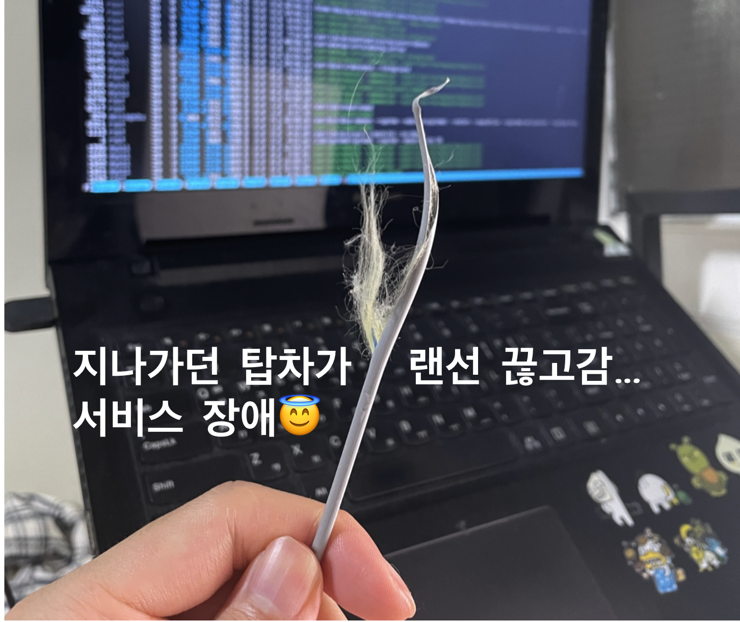 순간 무슨 사고라도 밖에 터졌나 했는데 너무 조용하고..."뭐지?" 하다가 벽을 보니까 뭔가 끊어진 선이 하나... 보이더라고요. 3초간 머엉~ 하고 생각하다가 랜선인가? 하고 생각했는데 ㅋㅋㅋㅋ 서버가 죽었다고 슬랙 알림이 오기 시작했습니다ㅋㅋㅋㅋㅋ