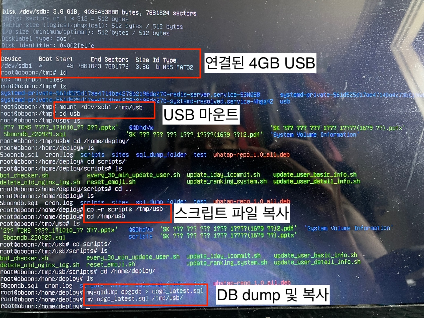 USB 마운트 해서 파일 복사하는 과정 탑차가 저희집 랜선을 끊고 간 덕분에 usb 마운트 해서 파일 옮기는 법도 알게 되었네요 ㅎㅎ 일단 파일들을 옮기고 기존 홈서버와 동일하게 환경 세팅을 했습니다.