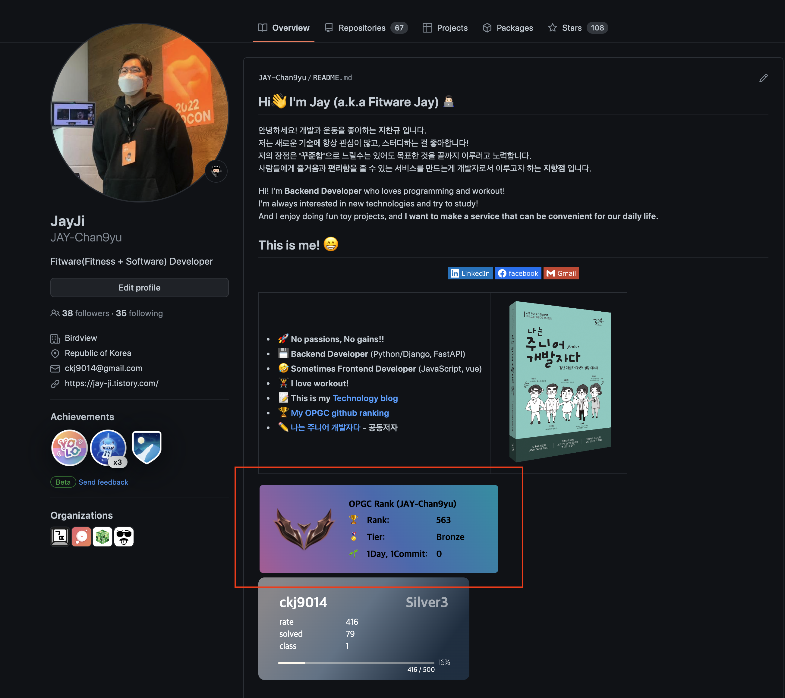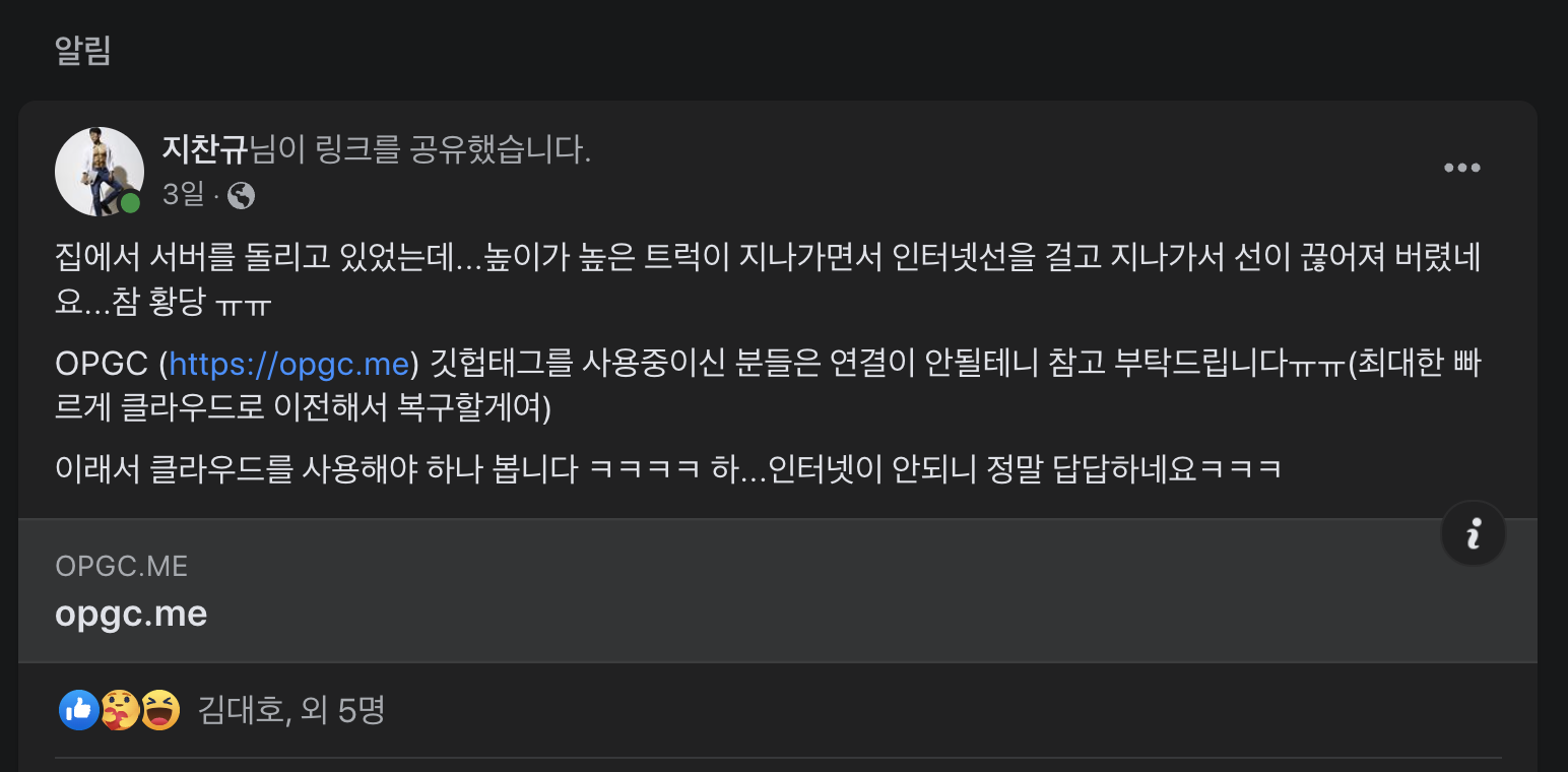 readme에 위 빨간박스 안에 뱃지로 제공해주는 OPGC 뭐 당장 인터넷이 안되는건 상관없는데 유저들이 사용하고 있는 OPGC에 장애가 생기는게 걱정이었습니다. OPGC에서는 개발자 랭킹을 github 뱃지(?)로 제공하고 있어서 서비스 장애가 나면 깃헙 readme에 엑박(엑스박스)떠서 보기 좋지 않기 때문입니다.