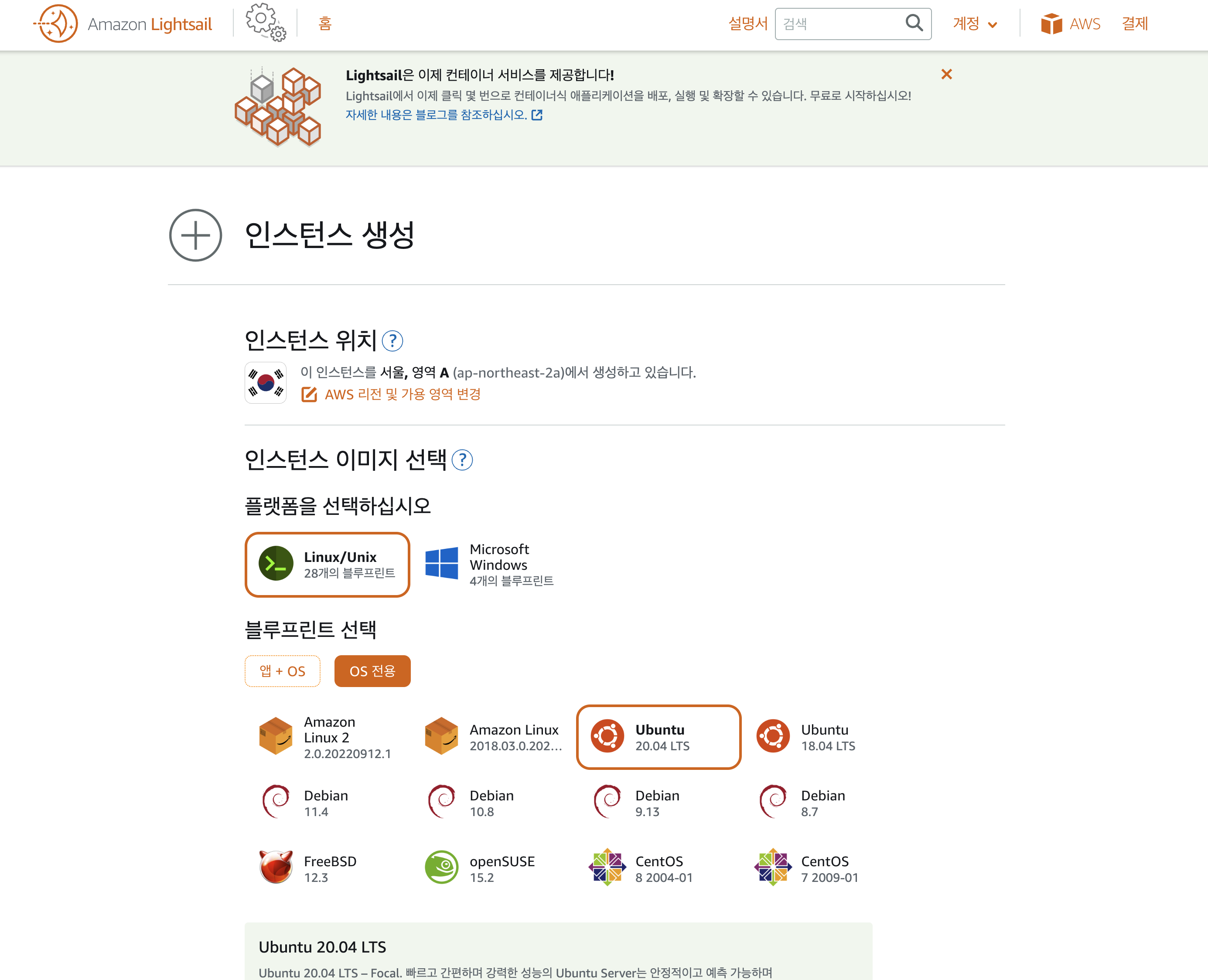 이전 직장에서 동료들이 AWS Lightsail로 토이프로젝트를 서빙하고 있고 값이 싸다고 알려준 적이 있어서 바로 AWS로그인해서 Lightsail페이지로 들어갔습니다.