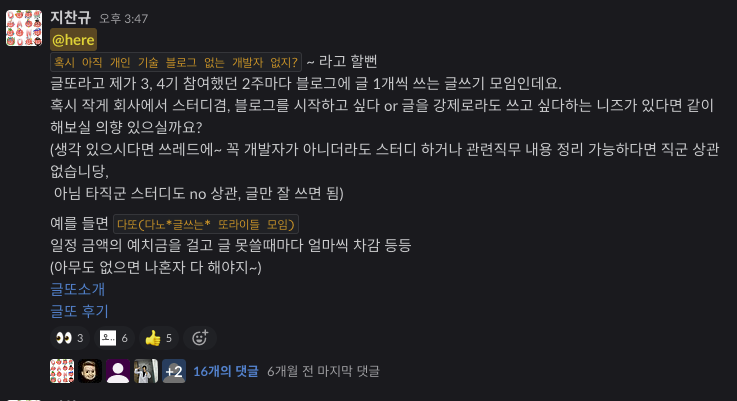 채널에 글쓰기를 함께할 동료들을 모았다 글을 읽는 여러분들도 마찬가지겠지만, 저는 '성장'을 중요하게 생각하는 사람입니다. 근데 이 '성장'이 저 혼자만의 성장이 아니라 나, 동료, 회사의 성장을 말합니다!