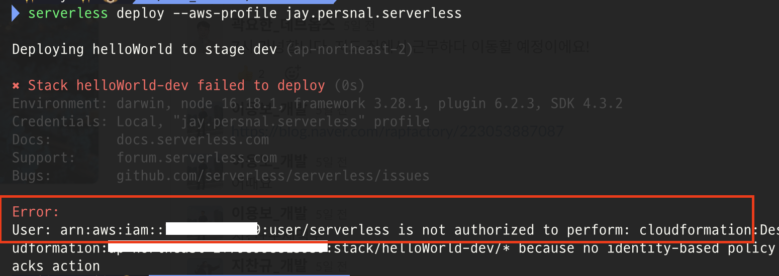 배포시 연관된 리소스들에 대한 권한이 없으면 에러가 납니다 배포할 때 사용할 리소스들에 대한 권한이 IAM 계정에 없으면 위처럼 에러를 뿜습니다. 위 에러는 처음에 제가 CloudFormation에 대한 권한을 주지 않아서 에러가 나더라고요 ㅎㅎ 근데 이게 일일이 사용할 인프라들에 대한 권한을 줘야 하다 보니 한 5개 추가하다가 계속 에러가 나서 그냥 administrator 권한을 줘버렸습니다 ㅎㅎ