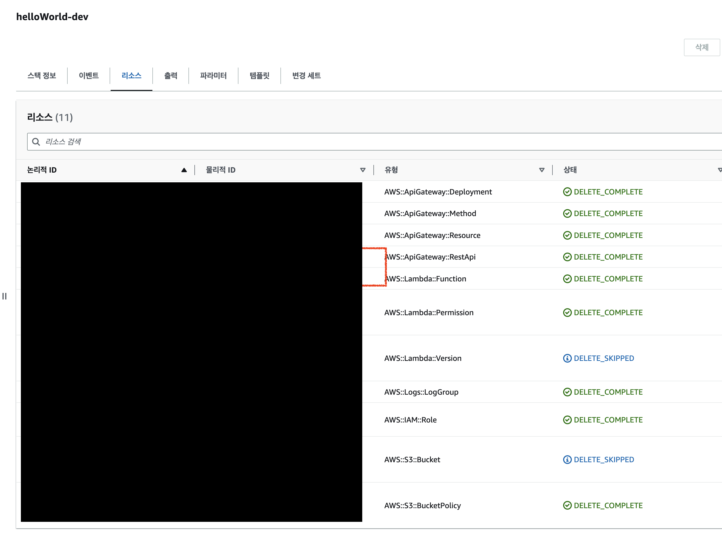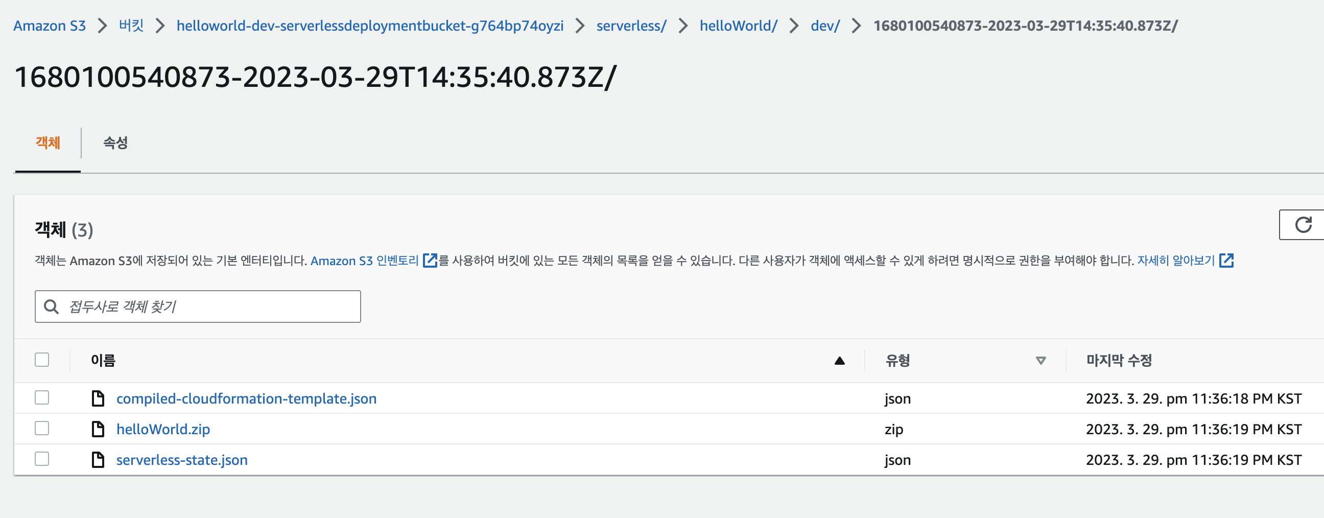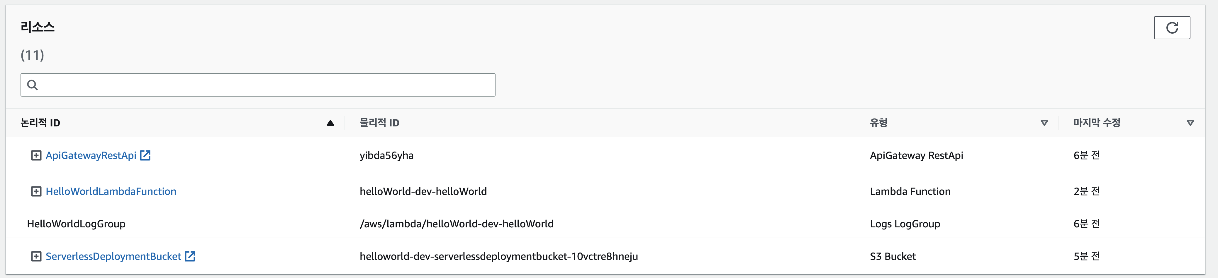 배포 파일은 S3에 올라가는걸로 보이네요 CloudeFormation에 가보면 어떤 이벤트들이 있었고 어떤 리소스가 생겨났는지 한 번에 확인할 수 있습니다. 저같은 경우는 HTTP 이벤트를 사용한다고 yaml에 적었기 때문에 API Gateway까지 자동으로 생성되고 람다와 연결된걸 확인 할 수 있었습니다.