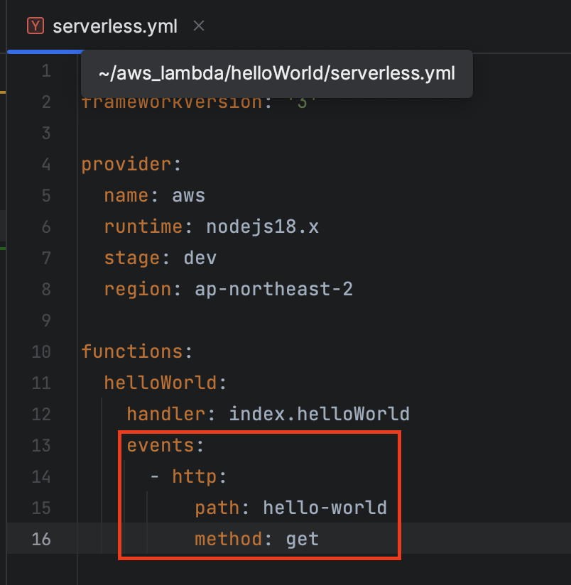 배포전 yaml파일을 살짝 수정하겠습니다. 저는 HTTP GET 호출을 사용하기 위해서 다음과 같이 events를 추가했습니다.