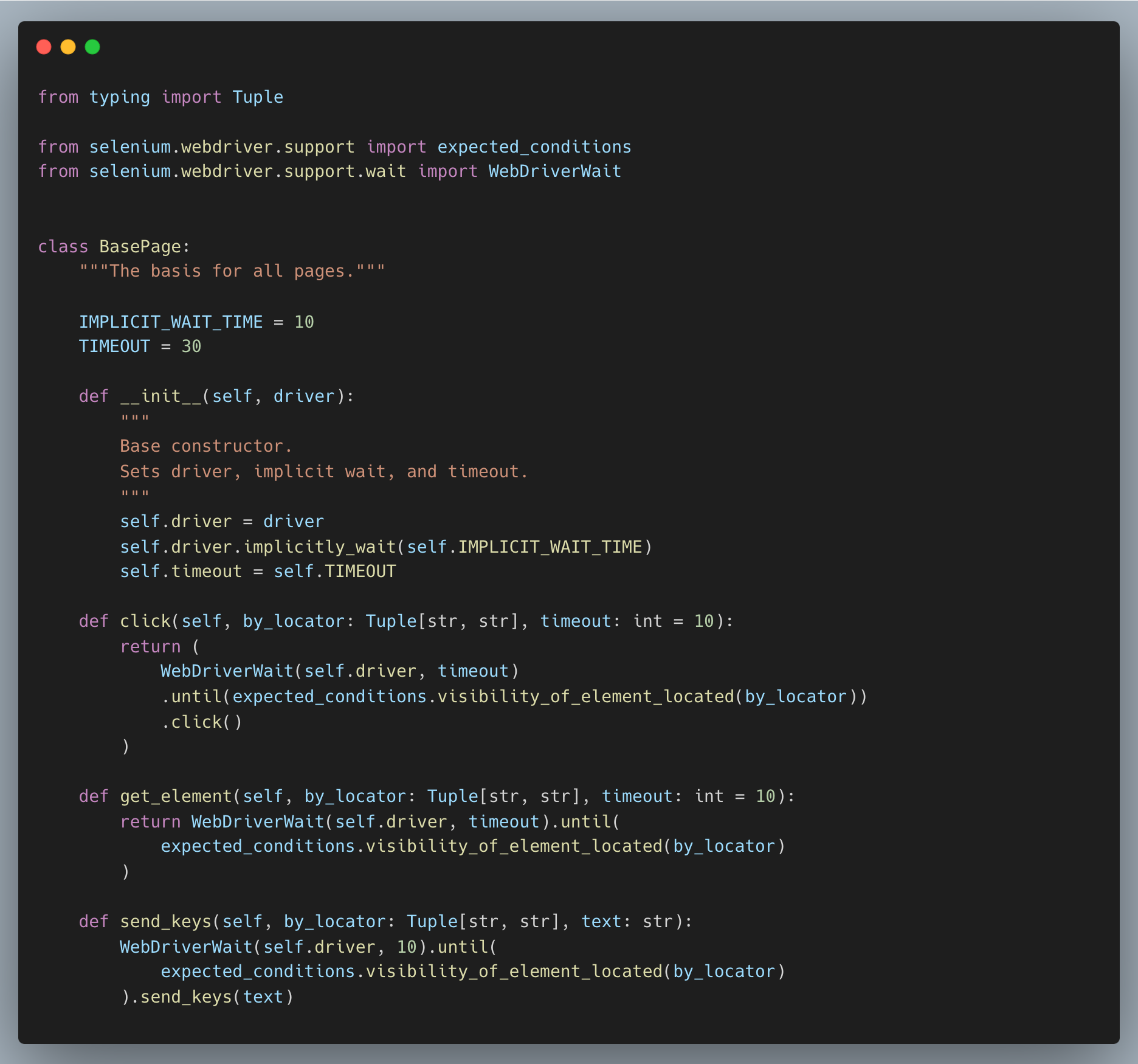 BasePage에서는 click, get_element, send_keys와 같은 공통 동작들을 구현해 놓았습니다.