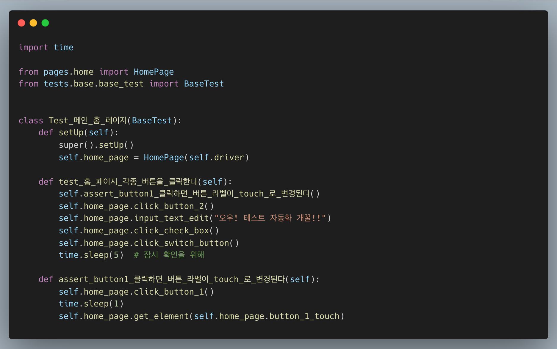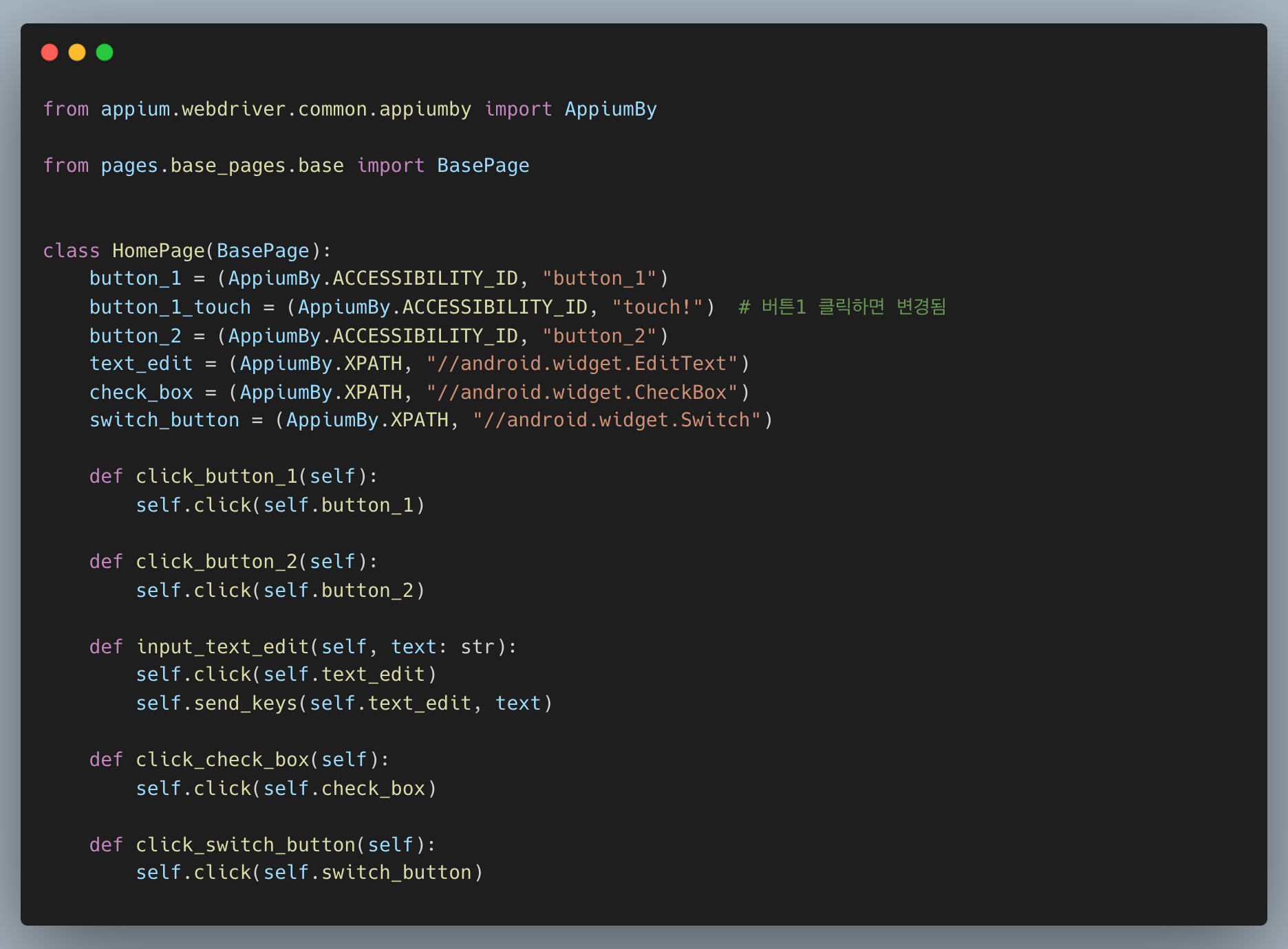 HomePage에는 홈화면의 버튼들과 그 버튼들에 대한 액션을 정의했습니다. 각 element들의 속성은 Appium Inspector를 통해서 추출하면 됩니다.