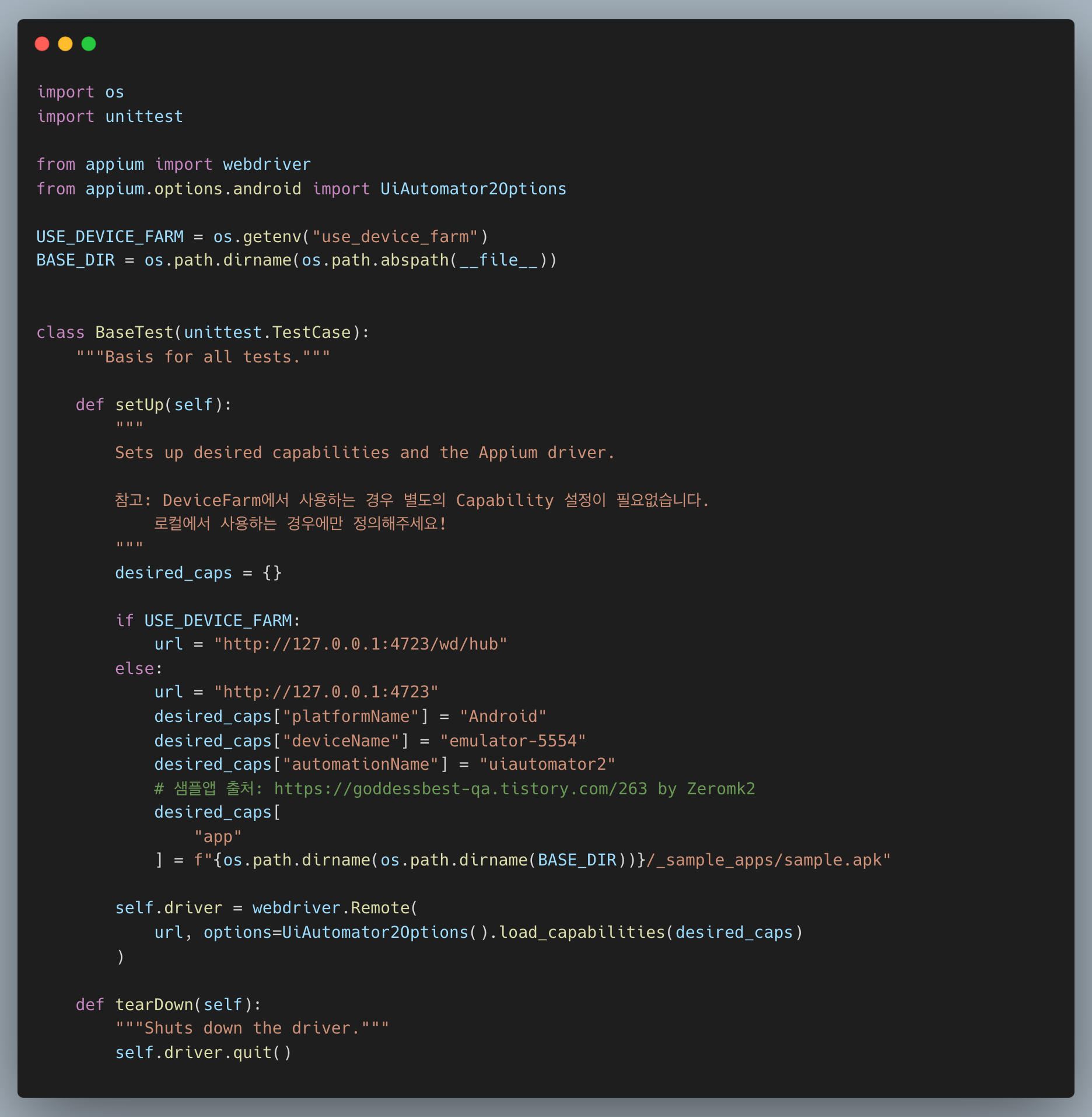 python을 사용해 보신 분들이라면 unnittest, pytest에 대해서 한 번쯤 들어 보셨을 텐데요. Appium 테스트도 똑같습니다! 일단은 Appium Driver를 연결을 위한 BaseTest 클래스를 만듭니다.
