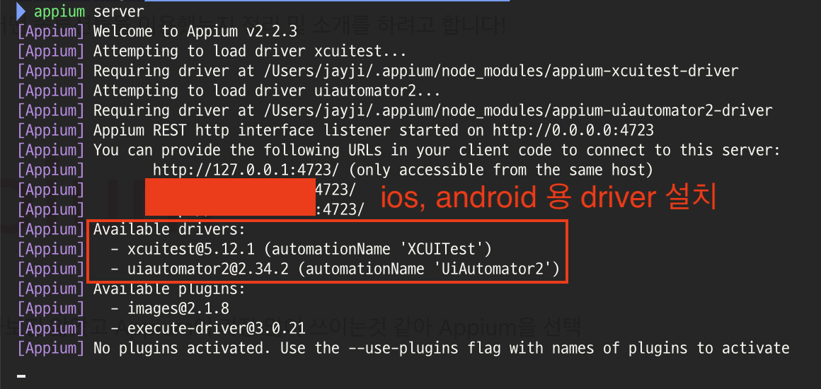 - Appium 드라이버 및 해당 종속성을 설치. (ios = xcuitest, android =uiautomator2)