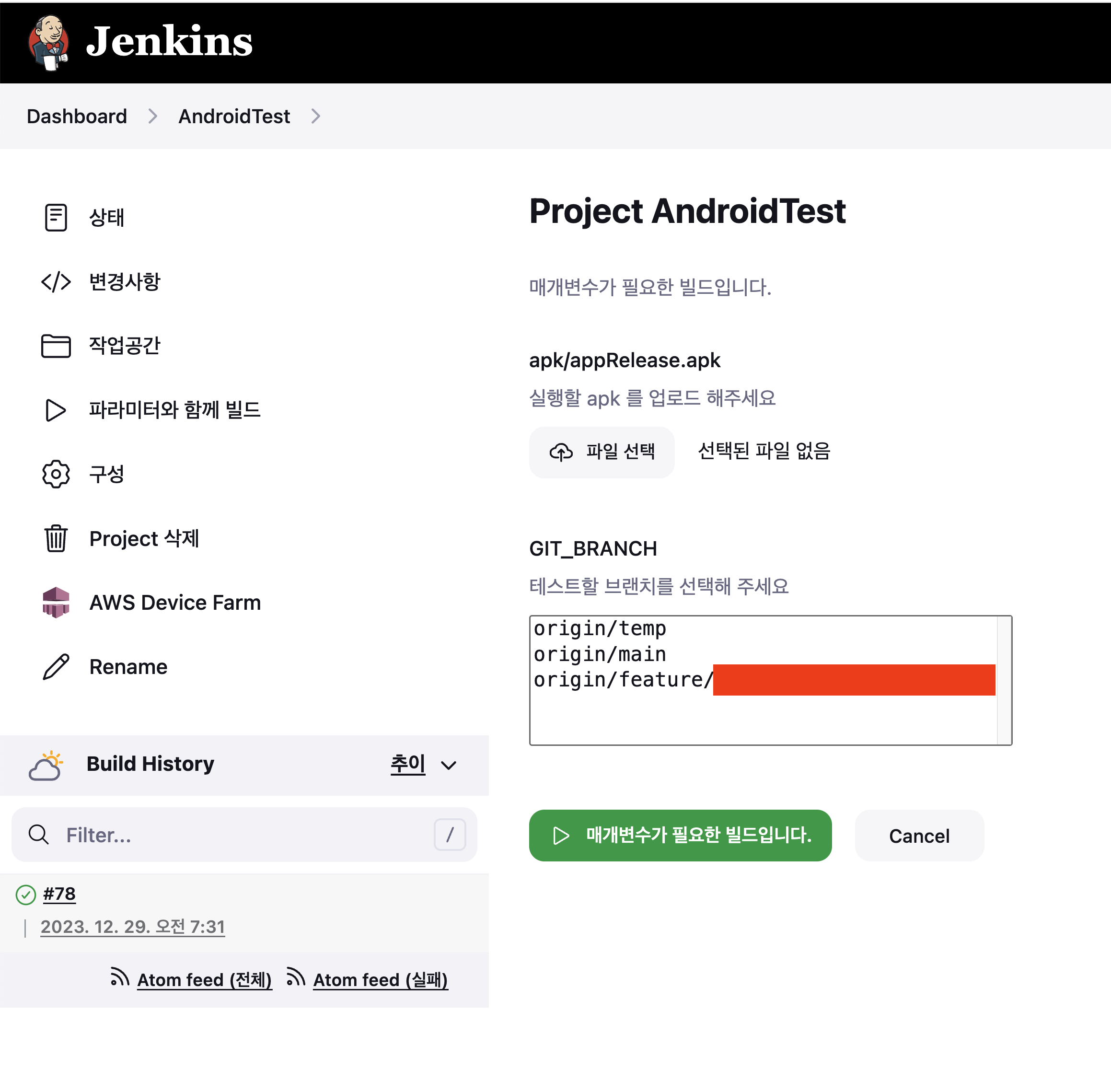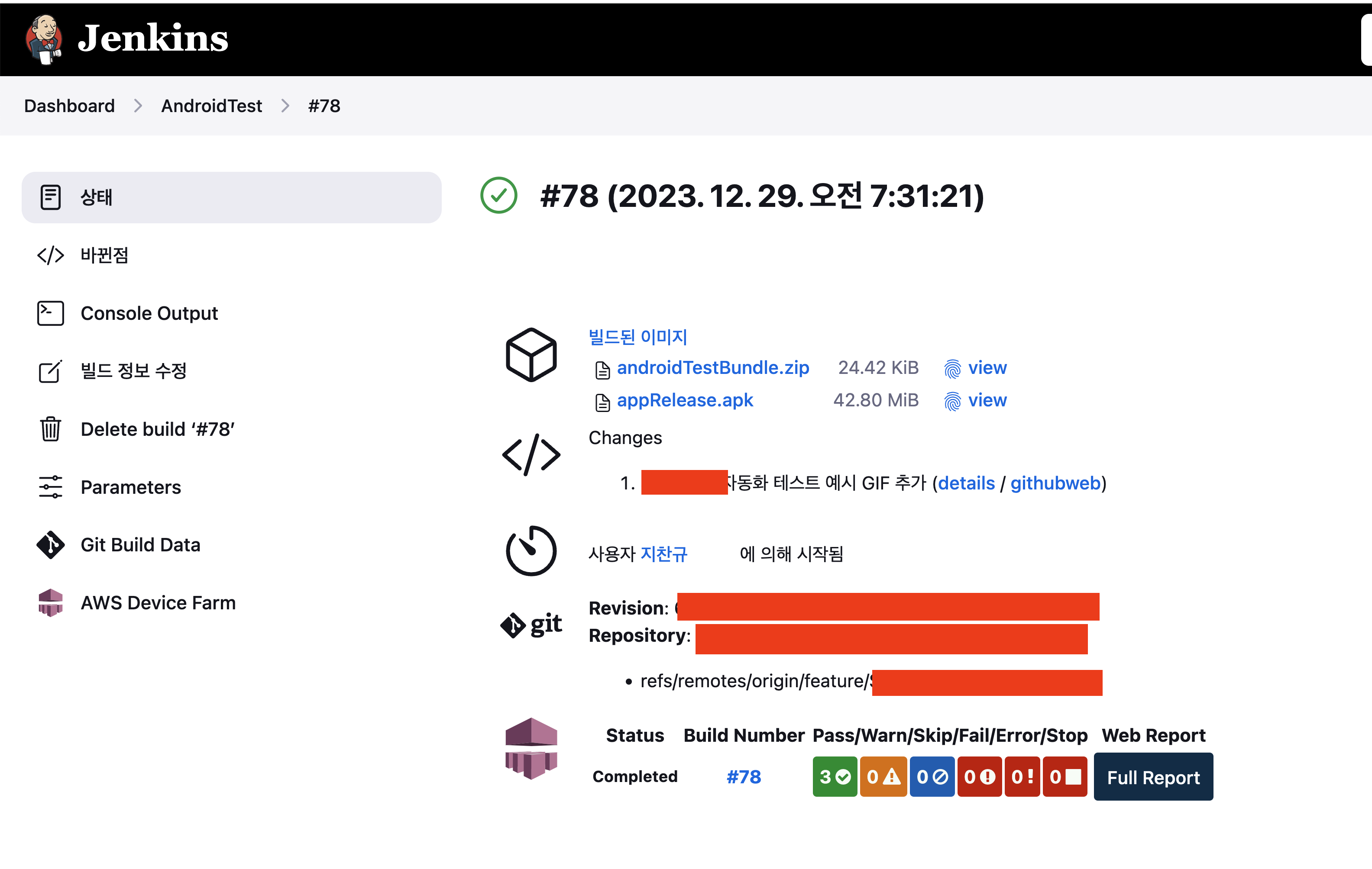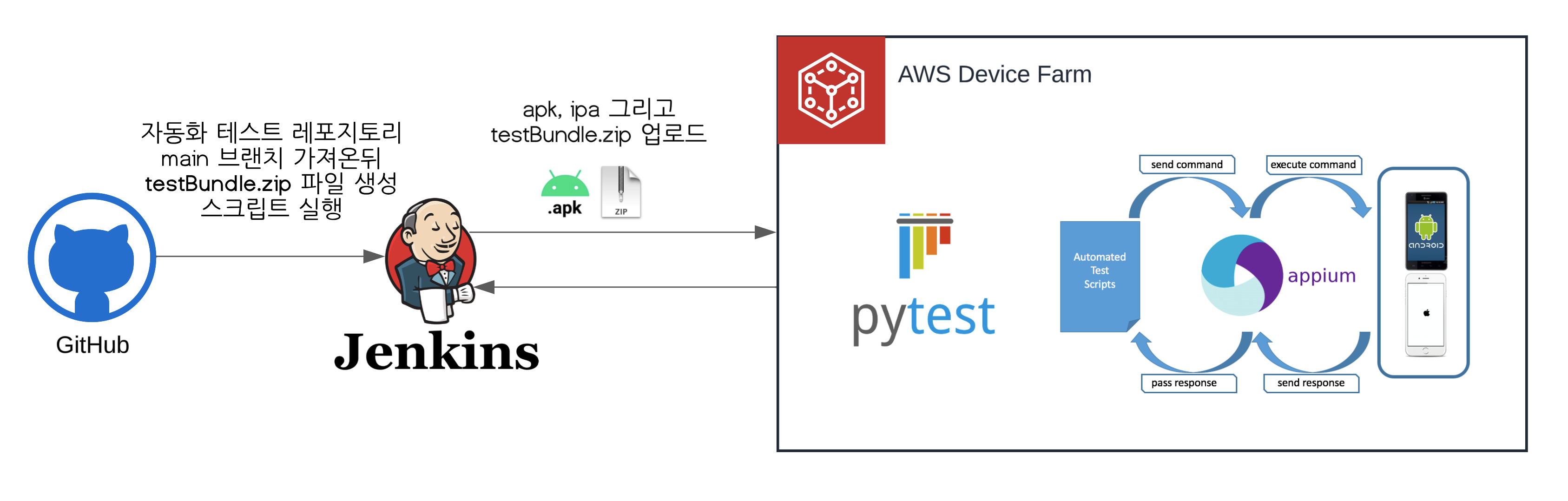 jenkins에서 테스트할 apk를 업로드하고 github branch를 선택해서 build하게 되면 AWS DeviceFarm에서 테스트가 실행하고 결과를 알려준다 최종적으로 제가 구현한 형태는 위 이미지처럼 동작합니다. 필요에 따라서 apk 빌드부터 업로드하는 부분까지 자동화할 수 있을 것 같습니다. 위 내용도 자세하게 설명하면 좋겠지만 이번 포스팅에서는 다루지 않고 따로 글을 쓰도록 하겠습니다🙏🏻