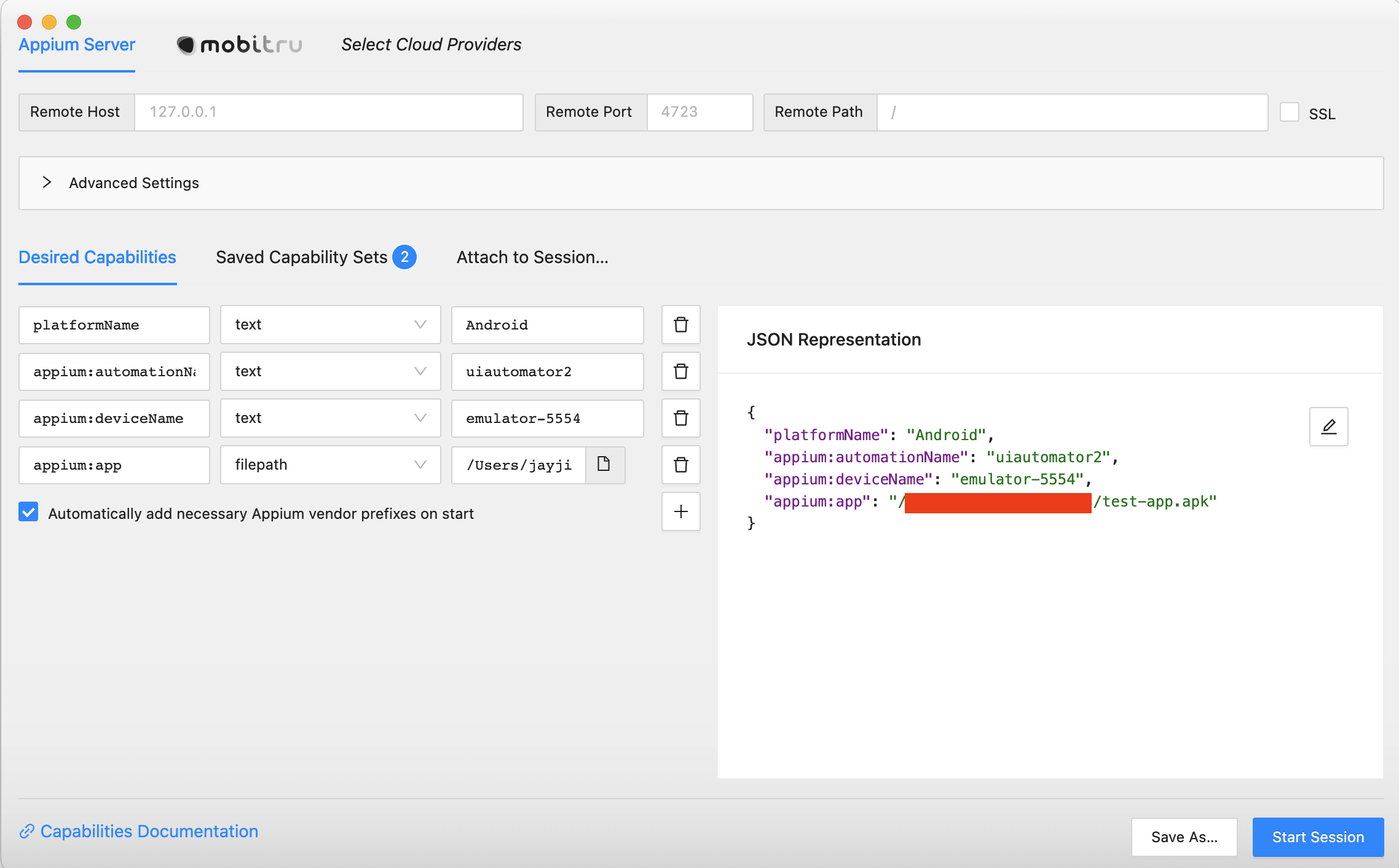 { "platformName": "Android", "appium:automationName": "uiautomator2", // 안드로이드 전용 드라이버 "appium:deviceName": "emulator-5554", // 안드로이드 에뮬레이터는 이 이름으로 고정 "appium:app": ".../app.apk" // apk 경로 }- ios Device