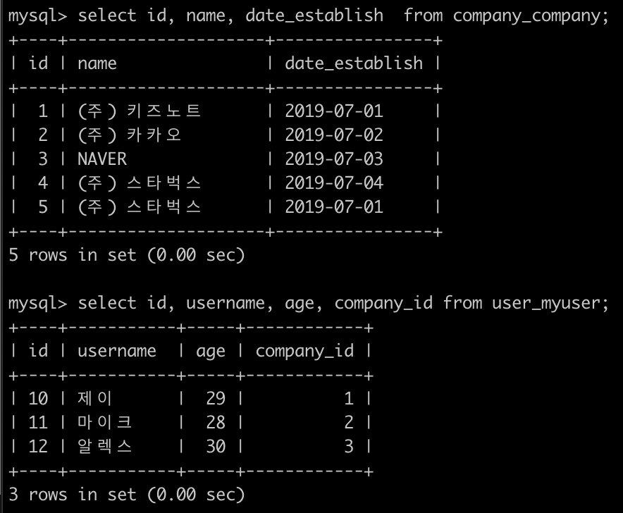 - MyUser 모델에서 가져온 3개의 data에 OneToOne으로 연결된 Company 모델을 가져오는 쿼리 3개