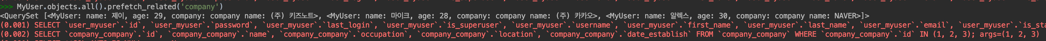 select_related는 inner join으로 쿼리셋을 가져오고, prefetch_related는 myuser, company 에 대해 각각의 쿼리로 쿼리셋을 가져옵니다.