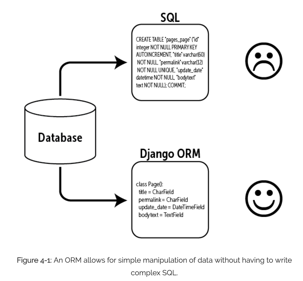 이미지 출처 : Django Book(https://djangobook.com/) ORM(Object-relational Mapping)은 데이터 베이스와 객체지향 프로그래밍 언어 간의 호환되지 않는 데이터를 변환하는 프로그래밍 기법입니다.(from wiki) 간단히 말하면 SQL문을 몰라도 Django에서 지원하는 ORM을 통해 database에 접근해서 원하는 data를 가져오고, 저장도 할 수 있게 해주는 문법(?)입니다.
