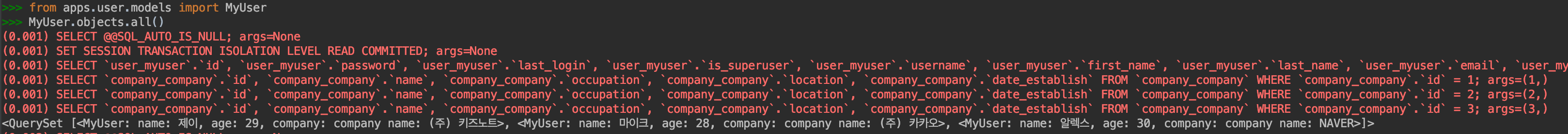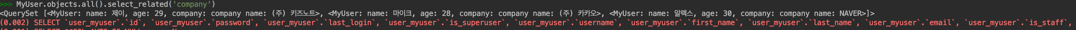 자! 이제 그럼 MyUser.objects.all().select_related('company')를 사용하여 Company 모델들까지 모두 가져와 보겠습니다.