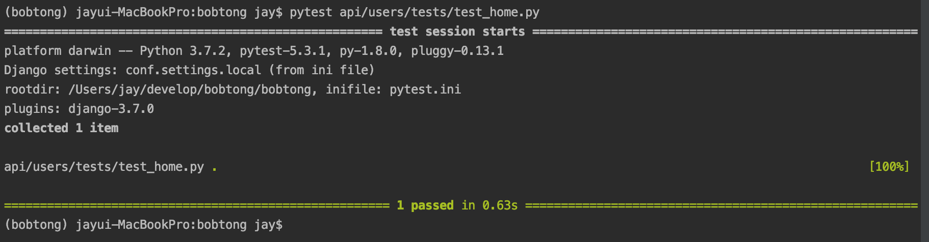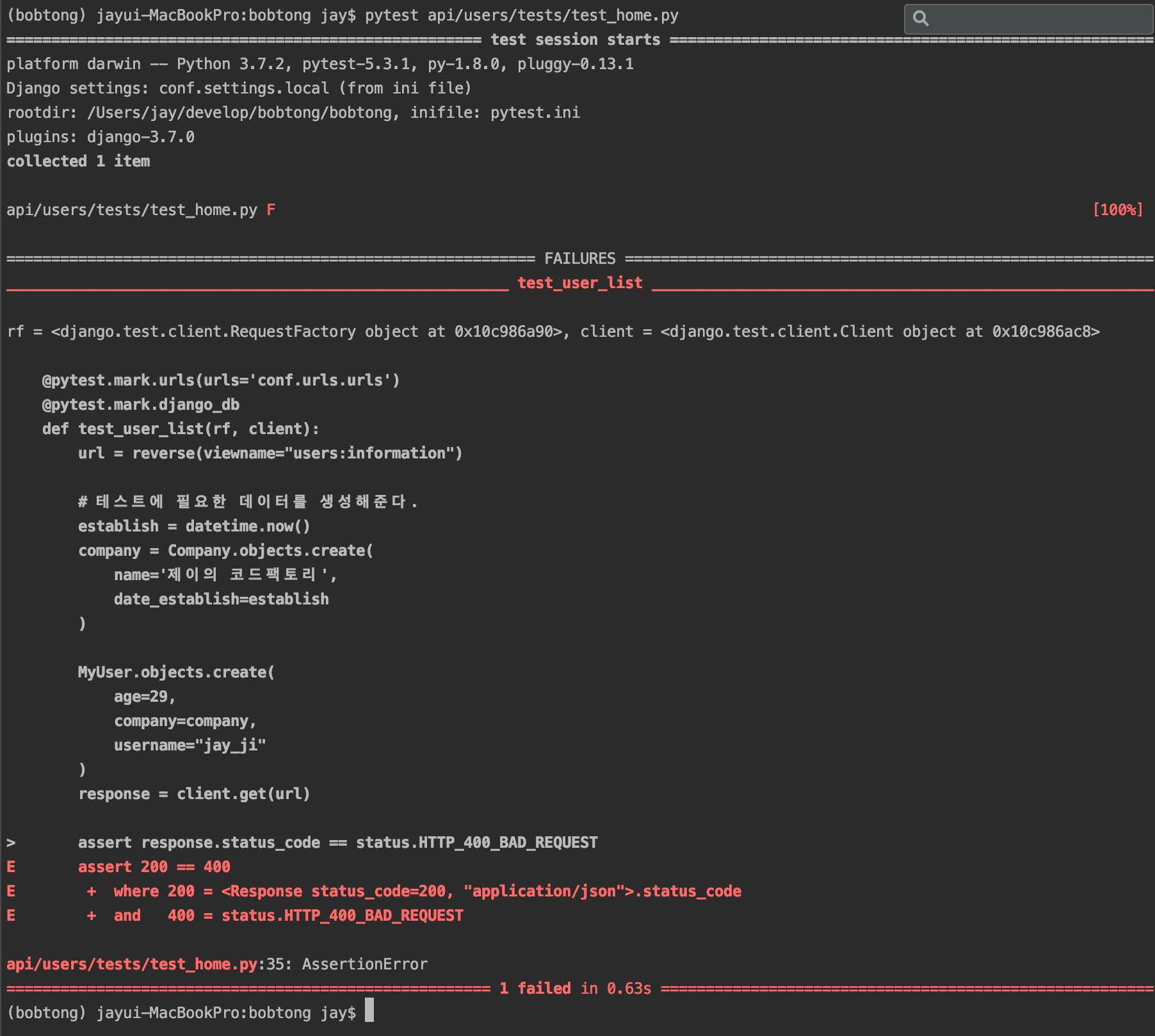 123456789101112131415161718192021222324252627282930313233343536373839import jsonfrom datetime import datetimeimport pytestfrom rest_framework import statusfrom rest_framework.reverse import reversefrom apps.company.models import Companyfrom apps.user.models import MyUserUSER_FIELDS_COUNT = 5 # serializer user fields count@pytest.mark.urls(urls='conf.urls.urls')@pytest.mark.django_dbdef test_user_list(rf, client):url = reverse(viewname="users:information")# 테스트에 필요한 데이터를 생성해준다.establish = datetime.now()company = Company.objects.create(name='제이의 코드팩토리',date_establish=establish)MyUser.objects.create(age=29,company=company,username="jay_ji")response = client.get(url)assert response.status_code == status.HTTP_200_OKdata = json.loads(response.content)assert len(data[0]) == USER_FIELDS_COUNT간단하게 코드를 설명하자면, User 모델을 생성하고 url : 'users:information' 을 호출합니다.