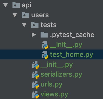1234567891011from rest_framework import serializersfrom apps.user.models import MyUserclass UserSerializer(serializers.ModelSerializer):class Meta:model = MyUserfields = ['id', 'username', 'email', 'age', 'company']위 api의 경로에 tests 폴더를 생성하고 __init__. py, test 할 파일을 생성합니다.