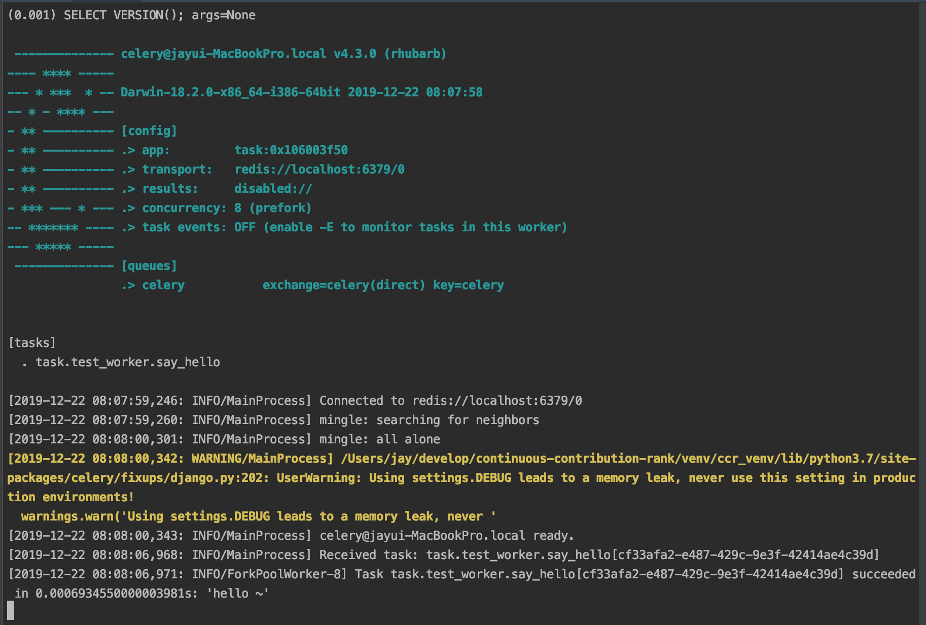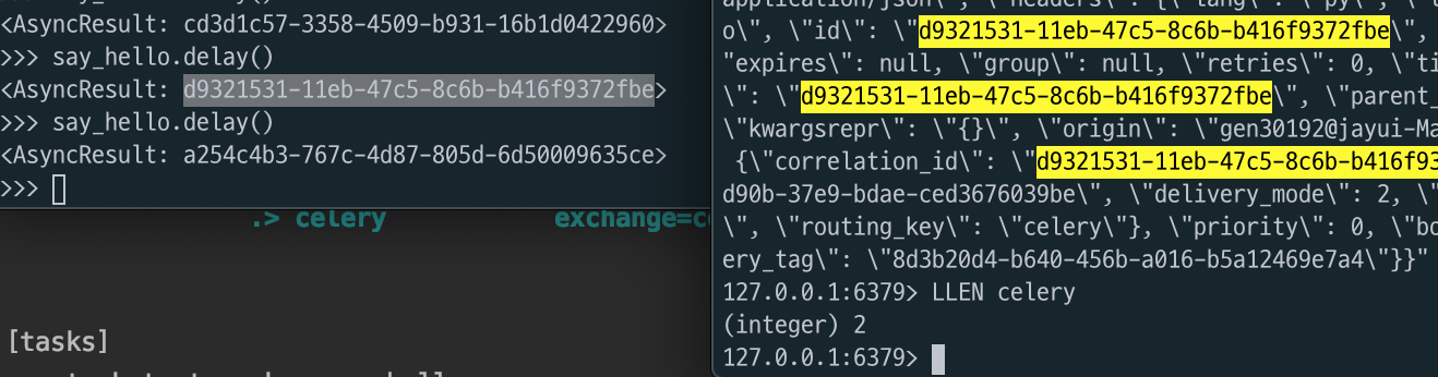 redis 등록된 task를 celery worker 가 실행한 모습 delay()를 통해 say_hello 동작을 queue에 등록하면, 실행 된 celery worker에서 redis에 등록된task(작업)을 실행하게 됩니다.
