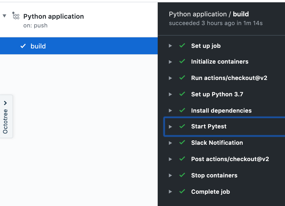 123456789101112131415161718192021222324252627282930313233343536373839name: Python applicationon:push:branches: [ master ]pull_request:branches: [ master ]jobs:build:runs-on: ubuntu-16.04services:mysqldb:image: mysql:latestenv:MYSQL_USER: 유저이름MYSQL_PASSWORD: 유저 패스워드MYSQL_DATABASE: 데이터베이스 이름MYSQL_ROOT_PASSWORD: root 패스워드ports:- 3306:3306options: --health-cmd="mysqladmin ping" --health-interval=5s --health-timeout=2s --health-retries=3steps:- uses: actions/checkout@v2- name: Set up Python 3.7uses: actions/setup-python@v1with:python-version: 3.7- name: Install dependenciesrun: |python -m pip install --upgrade pippip install -r requirements/base.txt- name: Start Pytestrun: |pytestcs 저는 이렇게 작성했습니다. services는 docker 컨테이너를 정의하는 것입니다. 저는 mysql을 사용할 것이므로 위에 작성한 것처럼 작성하였으며, 다른 걸 사용하고 싶은 분들은 다른 docker 이미지를 작성하시면 됩니다 (docker-compose.yml 작성과 동일합니다)