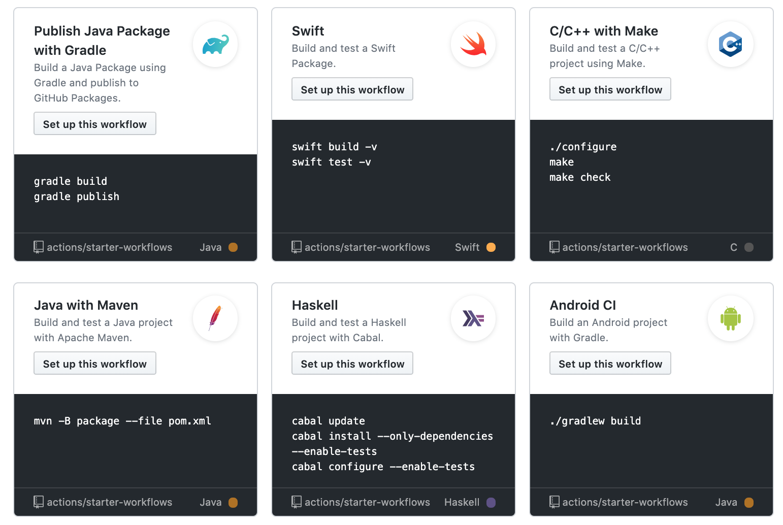 다양한 workflow 예시들 - workflow: 프로젝트의 build, test, package release, deploy를 위한 프로세스입니다. workflow를 만들어 저장하면 Github Actions에서 이 파일을 읽서 사용자가 custom 한 작업들을 실행합니다. yml 파일로 되어있습니다.