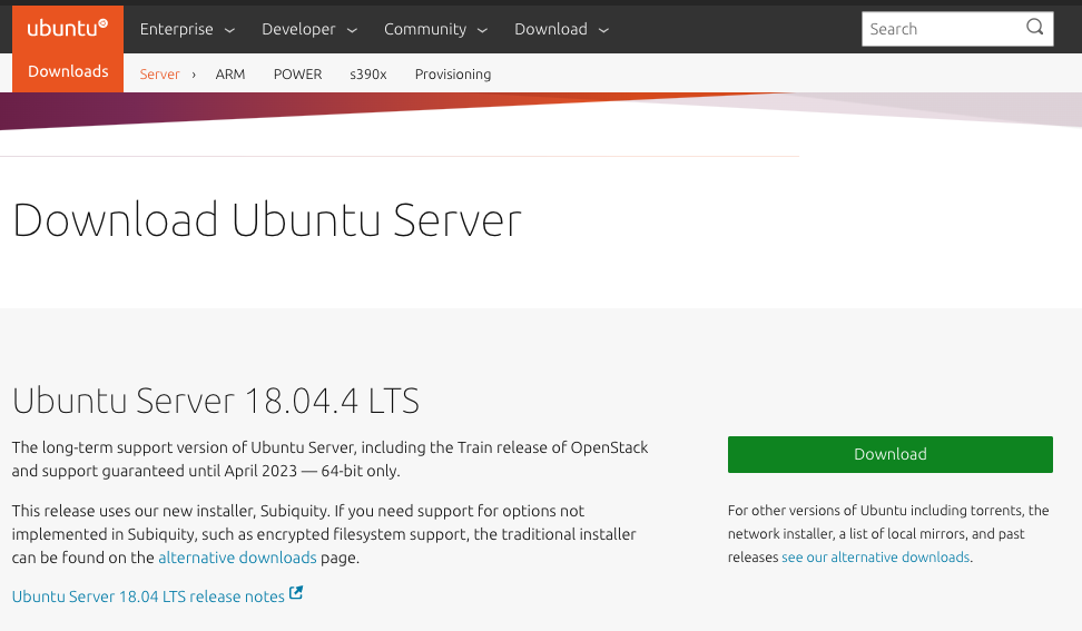 ubuntu 18.04 LTS Ios 파일 다운로드 페이지 일단 ubunut 설치를 위한 설치 파일이 필요하겠죠? ubuntu 홈페이지에 접속해서 원하는 버전의 iso 파일을 다운로드합니다. 저는 GUI는 따로 사용하지 않을 것 같아서 Ubuntu 18.04 LTS Server를 다운 받았습니다. 생각보다 용량이 작더라고요 (600Mb였나..?)