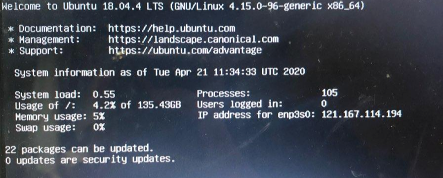정상적으로 부팅된 ubuntu server의 아름다운 모습 짜잔! login을 하게 되면 이런 화면을 보게 됐습니다! 기나긴 여정 끝에 이렇게 개인 서버를 만들게 되었네요! 🎉